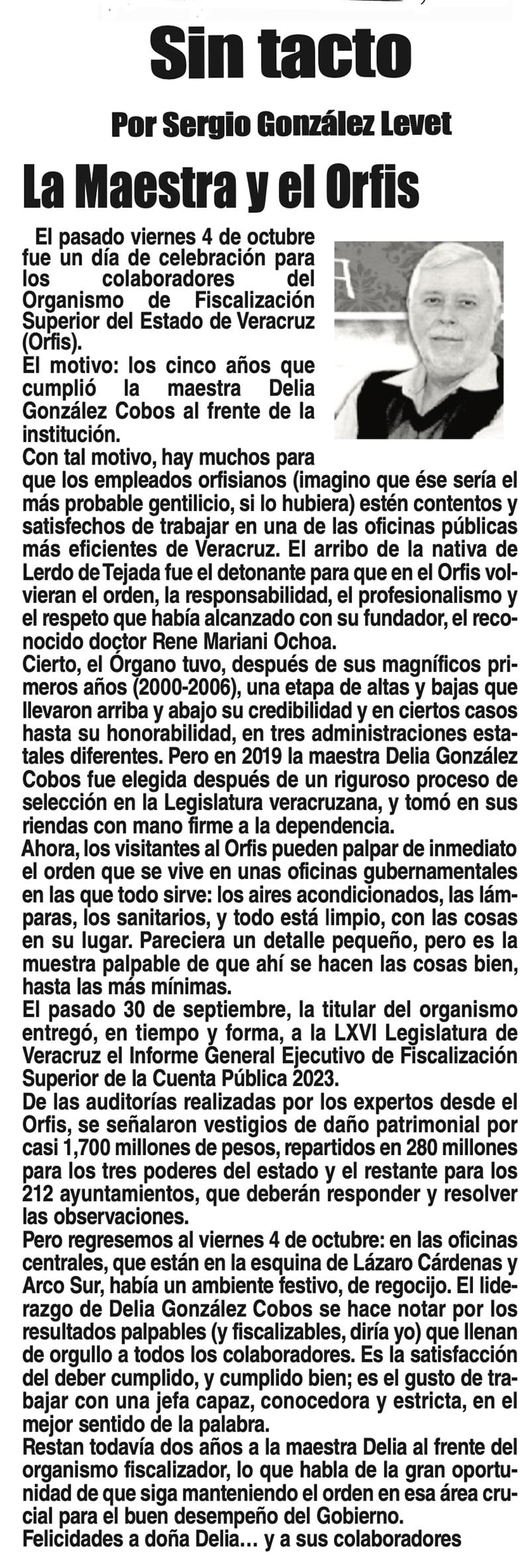 SIN TACTO | LA MAESTRA Y EL ORFIS - El pasado viernes 4 de octubre fue un día de celebración para los colaboradores del Organismo de Fiscalización Superior del Estado de Veracruz (Orfis). El motivo: los cinco años...