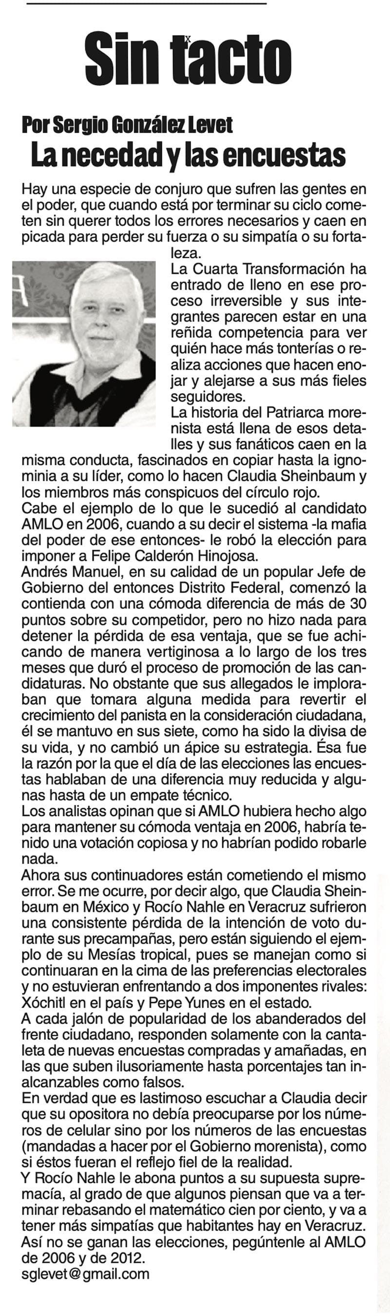 LAS COLUMNAS SIN TACTO | LA NECEDAD Y LAS ENCUESTAS - Hay una especie de conjuro que sufren las gentes en el poder... LA NECEDAD Y LAS ENCUESTAS... 28 febrero 2024 Más Noticias LAS COSAS COMO SON | - MAS QUE UN DIARIO... TEXTO IRREVERENTE | LE VA A 'ECHAR GANITAS' - Al parecer, el asunto es 'chimoltrufiar' o sea lo mismo decir una cosa que otra. En marzo, el gobierno estatal informó que el programa de rehabilitación de carreteras y caminos conocido como "Bachetón"... ACERTIJOS | EL QUINTO PARTIDO - En la historia de los mundiales, México nunca ha jugado el quinto partido fuera de casa. Lo más que hemos alcanzado es el cuarto juego y de allí nos mandan a casa… A MIL POR HORA | - **Un matrimonio feliz **Apocalipsis jarocho **La isla de los pedófilos **“Amor con amor se paga”... A MIL POR HORA | - **Chicas más guapas **Días revolcados **Fascinantes artistas **Academia de Ególatras... CANCIONERO | EL PAN Y EL LLORO - Nada es accidental en la política. Este fin de semana, la señora presidente con A de patria tendrá una magna concentración de sus seguidores para celebrar el aniversario... TEXTO IRREVERENTE | ENNOCHEBUENADOS - La mercadotecnia adelanta todo y, ni modo, hay que lidiar con eso. Cuando todavía no acababa noviembre ya se vendían productos navideños y ahora mismo por doquiera se ven locales adornados con ese motivo... SIN TACTO | LAS VÍSPERAS - ¿Se acuerda la memorable lectora? ¿Recuerda el memorioso lector?: “Ya va llegando diciembre y sus posadas. Se va acercando ya también la Navidad. El año nuevo... LAS COSAS COMO SON - VAYA CINISMO... TEXTO IRREVERENTE | AÑO BUENO, AÑO MALO - El 2024 fue un año de suerte y abundancia. Este 2025 ha corrido en su contra con infortunio político y mediático. ¿‘Annus horribilis’? Tal vez no llega a tanto, pero sí desastroso y confirmatorio de sus...