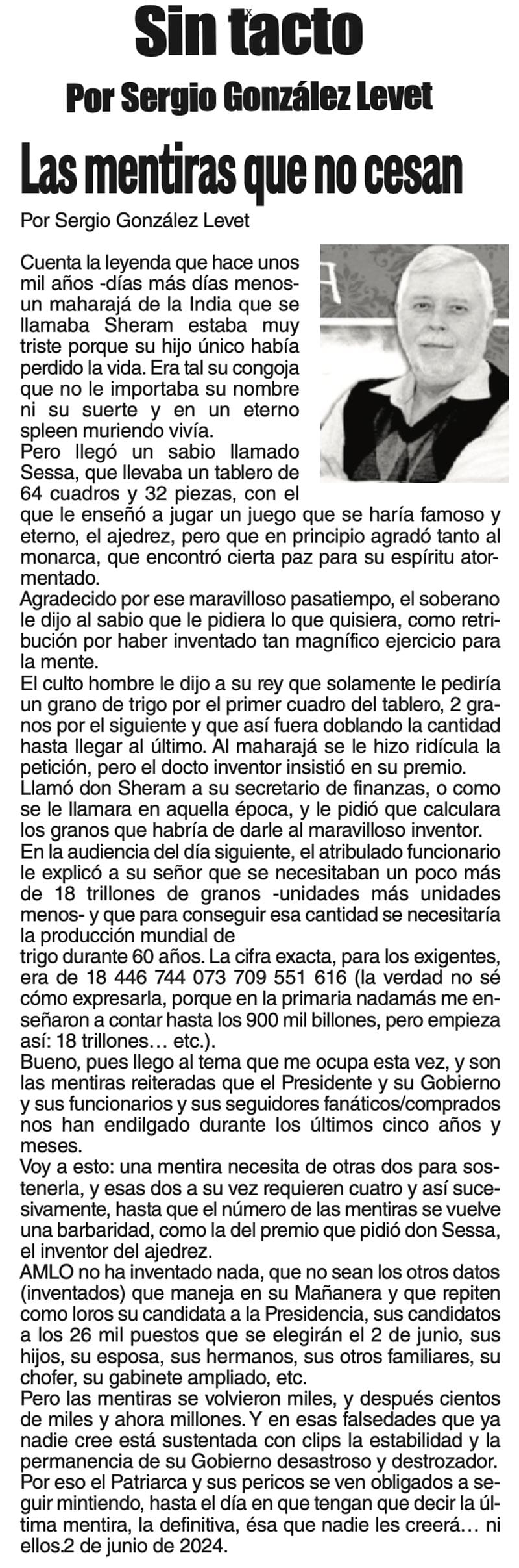 LAS COLUMNAS SIN TACTO - LAS MENTIRAS QUE NO CESAN... LAS MENTIRAS QUE NO CESAN... 23 enero 2024 Más Noticias LAS COSAS COMO SON | - MAS QUE UN DIARIO... TEXTO IRREVERENTE | LE VA A 'ECHAR GANITAS' - Al parecer, el asunto es 'chimoltrufiar' o sea lo mismo decir una cosa que otra. En marzo, el gobierno estatal informó que el programa de rehabilitación de carreteras y caminos conocido como "Bachetón"... ACERTIJOS | EL QUINTO PARTIDO - En la historia de los mundiales, México nunca ha jugado el quinto partido fuera de casa. Lo más que hemos alcanzado es el cuarto juego y de allí nos mandan a casa… A MIL POR HORA | - **Un matrimonio feliz **Apocalipsis jarocho **La isla de los pedófilos **“Amor con amor se paga”... A MIL POR HORA | - **Chicas más guapas **Días revolcados **Fascinantes artistas **Academia de Ególatras... CANCIONERO | EL PAN Y EL LLORO - Nada es accidental en la política. Este fin de semana, la señora presidente con A de patria tendrá una magna concentración de sus seguidores para celebrar el aniversario... TEXTO IRREVERENTE | ENNOCHEBUENADOS - La mercadotecnia adelanta todo y, ni modo, hay que lidiar con eso. Cuando todavía no acababa noviembre ya se vendían productos navideños y ahora mismo por doquiera se ven locales adornados con ese motivo... SIN TACTO | LAS VÍSPERAS - ¿Se acuerda la memorable lectora? ¿Recuerda el memorioso lector?: “Ya va llegando diciembre y sus posadas. Se va acercando ya también la Navidad. El año nuevo... LAS COSAS COMO SON - VAYA CINISMO... TEXTO IRREVERENTE | AÑO BUENO, AÑO MALO - El 2024 fue un año de suerte y abundancia. Este 2025 ha corrido en su contra con infortunio político y mediático. ¿‘Annus horribilis’? Tal vez no llega a tanto, pero sí desastroso y confirmatorio de sus...