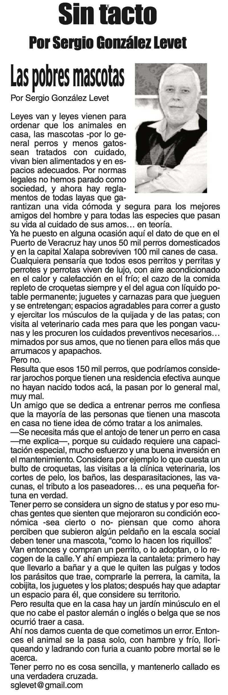 LAS COLUMNAS SIN TACTO - LAS POBRES MASCOTAS LAS POBRES MASCOTAS... 13 noviembre 2023 Más Noticias SIN TACTO | SOLO Y SÓLO /1 - Ha resultado muy polémica en el mundo de habla hispana la regla gramatical que impuso en 2010 la Real Academia Española de la Lengua cando desapareció el acento diacrítico para diferenciar el adjetivo “solo”… TEXTO IRREVERENTE | TURISMO DE BUFFET - Apresurados por revertir la mala publicidad de la marea negra contaminando el mar y el litoral jarochos, los propagandistas del gobierno estatal se pasaron el fin de semana difundiendo que las playas... ACERTIJOS | EL ABUELO SEBASTIAN EL CANO - Notiver lo tituló muy bien. Llegó a Veracruz el abuelo del Cuauhtémoc, el Buque Escuela español, Juan Sebastián Elcano, arribó al muelle del puerto de Veracruz y enseguida se convirtió en un sitio turístico... A MIL POR HORA | - **Cuentistas inmortales **Shorts electrizantes **Obsesión de la Bamba **Miami, paraíso de ricos... CANCIONERO | PIEL FINA - Nos tardamos un poco en entender que la señora presidente con A de Patria tiene la piel muy fina y sensible. Tan lo es, que no tolera ni siquiera la insinuación de que la perfección en sus esfuerzos no existe. Especialmente… LAS COSAS COMO SON - PEDI EL DESEO... ACERTIJOS | EL CINE REVITALIZADO - El cine día a día se revitaliza. Suelo presumir de ser cinero. Desde los tiempos remotos en que de chiquillo no salía de las tres salas cinematográficas que existían en mi pueblo: cine Margo, el Sección 25 de los... TEXTO IRREVERENTE | LOS TIJERETEADOS - Es un asunto que los desnuda por incumplir sus compromisos de serenar al país, ponerse al lado de las víctimas y hacerles justicia. Por eso les enoja mucho cuando se habla al respecto. Ya desde el sexenio pasado... A MIL POR HORA | - **La vida sigue… **Auge de taquerías **Peores desgracias **Crisis conyugal... SIN TACTO | AUSTERIDAD - Se muestra muy preocupada la presidenta Claudia Sheinbaum por los gastos superfluos e innecesarios que ocurren en el presupuesto público, y con tal situación, le dice al pueblo honesto y...
