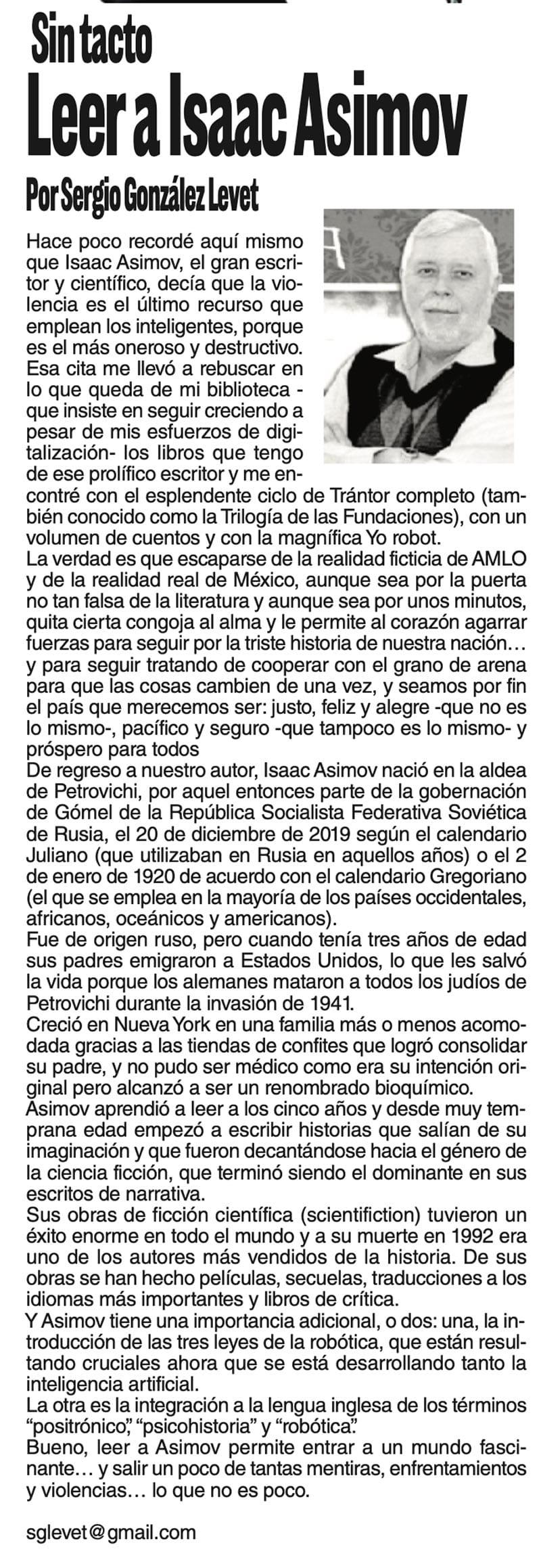SIN TACTO | LEER A ISAAC ASIMOV - Hace poco recordé aquí mismo que Isaac Asimov, el gran escritor y científico, decía que la violencia es el último recurso que emplean los inteligentes...
