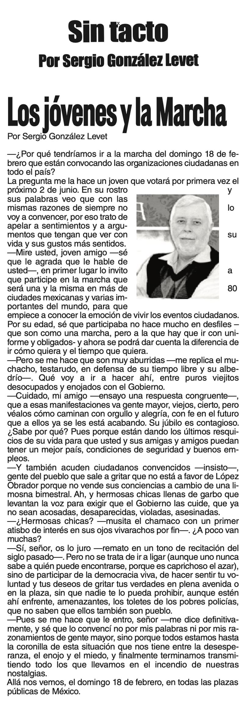 LAS COLUMNAS SIN TACTO -LOS JÓVENES Y LA MARCHA LOS JÓVENES Y LA MARCHA... 29 enero 2024 Más Noticias CANCIONERO | CANDIL DE LA CALLE - Ya corrió bastante tinta, inclusive en este espacio, reconociendo la simplemente digna conducta de la señora presidente con A de mujer durante sus muy publicitadas apariciones en su breve visita a Barcelona y... ACERTIJOS | DOS MUJERES. DOS PASIONES - Dos mujeres que piensan diferente y que, quizá estarán en trincheras opositoras. Una ya gobierna un país grande, México, la otra va a ser pronto la presidenta de Venezuela, en cuanto se ponga más quieto aquel... TEXTO IRREVERENTE | EN TRES ACTOS - Primer acto. Miguel Ángel Anaya Castillo, periodista independiente y dueño del portal informativo “Pánuco On Line” incomoda al poder municipal por reportar los abusos de poder y andanas insanas del alcalde… A MIL POR HORA | - **El mundo animal… **Retrato de Veracruz **Jarocho de Jack London **Lo mejor y peor del día... SIN TACTO | LA BRONCA EN SALUD ESTATAL - Son 26 mil trabajadores los que tiene en Veracruz el sector Salud y son ellos mismos los que están en un movimiento activo para exigir sus derechos no cumplidos y que se ponga la atención debida a los servicios... SIN TACTO | DEMENCIA SENIL - Hay una enfermedad mórbida en México que nos afecta de una manera que por lo general no se quiere reconocer. Es el Síndrome de Demencia Senil (SDS), que en México padecen un millón 300 mil personas, cerca... ACERTIJOS | JOSERRA EL PROTAGONISTA - La semana estuvo llena de protagonismos, uno de ellos José Ramón Fernández, el gran Joserra, quien presentó su libro que ahí voy leyendo a medias y que pronto comentaré. Tuvo tantos y tan buenos invitados, que... CANCIONERO | Las carambolas de Barcelona - Yo no sé de quién fue la idea, sospecho que de los estrategas de Pedro Sánchez, quién junto con la señora presidente con A de mujer Claudia Sheinbaum, son los únicos que pueden llamarse ganadores... TEXTO IRREVERENTE | EMBARCADOS - El barco fantasma, inventado por la zacatecana Rocío Nahle, nunca existió. Tampoco las chapopoteras naturales generaron el derrame de petróleo que manchó 900 kilómetros en el litoral... A MIL POR HORA | - **Diario de la muerte **Mil niños huérfanos **Tiros en la madrugada **Recuento de daños