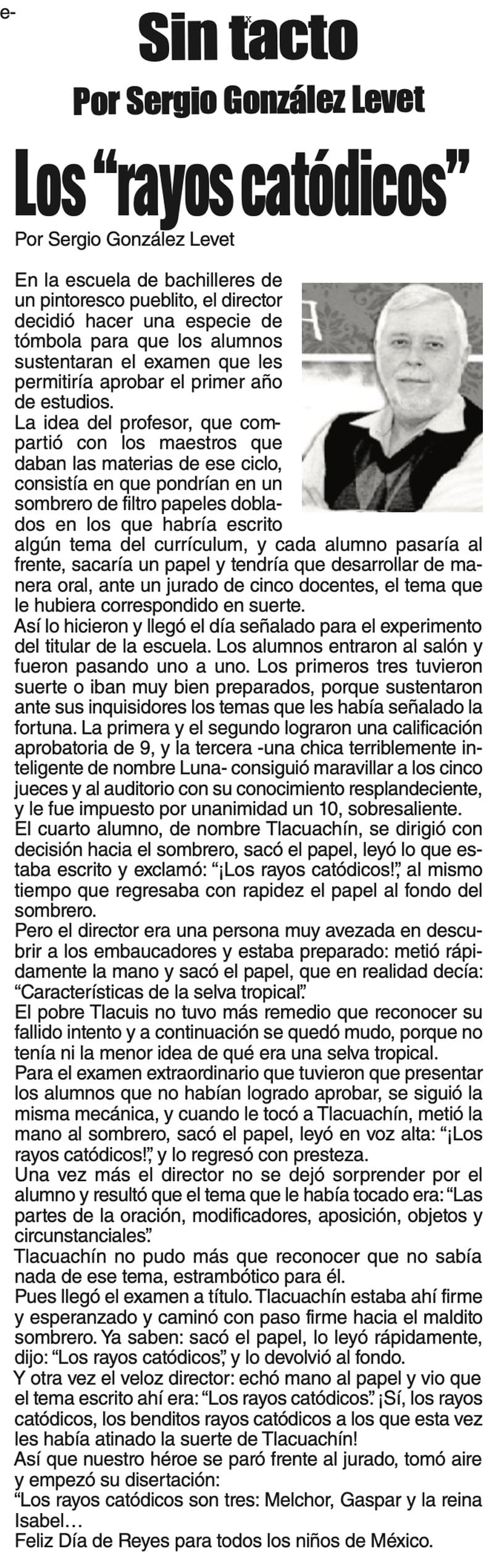 LAS COLUMNAS SIN TACTO - LOS "RAYOS CATÓDICOS" LOS "RAYOS CATÓDICOS"... 5 enero 2024 Más Noticias CANCIONERO | EUTANASIA - Yo no tengo particular afecto por los animales llamados de compañía o mascotas, con las que seres solitarios procuran agenciarse afectos mediante el truco del perrito en el parque. Confieso que… A MIL POR HORA | - **Huérfanos mil niños **Hablar mal de Veracruz **Mesianismo jarocho **Fidel Castro en el café... SIN TACTO | SIGUE ZEPETA - En un despido que sigue el canon instaurado por la presidenta Claudia Sheinbaum, la dirigente nacional de Morena, Luisa María Alcalde Luján, fue invitada a ocupar la consejería jurídica de la Presidencia de la... TEXTO IRREVERENTE | ABRAZO FRATERNO - “Dios traerá con Jesús a los que se durmieron en Él” (1 Tesalonicenses 4:13). Desde acá va un abrazo solidario y fraterno para el periodista Luis Velásquez Rivera por la partida de su hermano... ACERTIJOS | LOS TIROTEOS EN LA TELE - Si uno llegara a conocer un nuevo país, suponiendo México, y comenzara a conocerlo y encendiera la tele para revisar el noticiero nocturno, qué bárbaro, pensarían que estamos en un campo de guerra y batalla... ACERTIJOS | LOS 100 AÑOS DE JULIO SCHERER - Julio Scherer García murió en 2015. La unanimidad, esa flor rara, rodeó sus funerales con la corona de la admiración. En estos días cumplió cien años de su nacimiento y la prensa recuperó algo de... A MIL POR HORA | - **Perfil de un mexicano **El jarocho patriota **La lengua más larga **Estilo Porfiriano... SIN TACTO | LA UV DISCRIMINA A JUAN JOSÉ BARRIENTOS - Juan José Barrientos es un ave de tempestades, como corresponde a todo escritor genial. En su larga, larguísima trayectoria literaria ha acumulado estudios y experiencia que se han adjuntado… TEXTO IRREVERENTE | FASCISMO ANTIHUERTISTA - Antes fue deducción, ahora es certeza. Desde el congreso local que dirige Esteban Bautista se financian asambleas y propaganda para denostar al senador Manuel Huerta. Es decir, se utiliza el... CANCIONERO | INTELIGENCIA - No me pidan que sustente la veracidad de lo que voy a escribir enseguida, porque no puedo hacerlo; tampoco voy a proporcionar fuentes de información fidedignas, ni pruebas documentales confiables. No me las pidan...