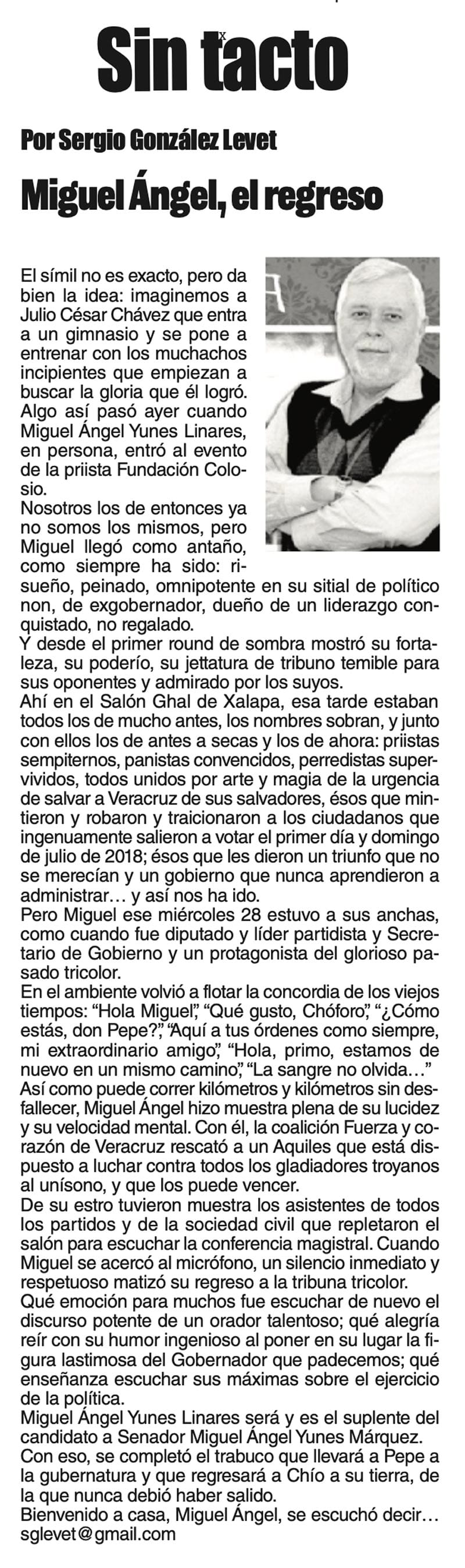 LAS COLUMNAS SIN TACTO | MIGUEL ÁNGEL, EL REGRESO - El símil no es exacto, pero da bien la idea: imaginemos a Julio César Chávez que entra a un gimnasio y se pone a entrenar... MIGUEL ÁNGEL, EL REGRESO... 1 marzo 2024 Más Noticias ACERTIJOS | QUE NO SE NOS OLVIDE (DISCURSO HIJA DE MARIA CORINA MACHADO/OSLO) - “Cuando comprendimos cuán frágiles se habían vuelto nuestras instituciones, ya era tarde. El cabecilla de un golpe militar contra la democracia fue elegido presidente... A MIL POR HORA | - **¿Estás conmigo o Vs. mí? **Cura para el Alzheimer **Zeus, dios querendón… **Clóset de Nahle CANCIONERO | SANTA CLAUS IS COMING TO TOWN - Yo sé que es mucho pedir, mucho más para un infiel como debo ser considerado en la Santa Iglesia Católica, Apostólica y Romana, sugerirle al Todopoderoso que -en su omnipotencia- me hiciera Papa de su iglesia… TEXTO IRREVERENTE | UN OSCURO DEL PASADO - Más temprano que tarde están confirmándose los augurios azarosos para la Fiscalía General de Justicia (FGJ) con la imposición de la 'bolaochista'-cuitlahuista Aurelia Jiménez quien... LAS COSAS COMO SON - ESTARIA CREMADO... SIN TACTO | 51… Y MÁS - Hace un año y tres días, Notiver celebró su medio siglo de ser el periódico que los jarochos necesitaban y que han disfrutado al máximo. 19,230 días en que el periódico ha estado saliendo... CANCIONERO | PIRATAS DEL CARIBE - A la pregunta de qué va a hacer con el petróleo que llevaba el barco tanque grandote llamado Skipper y con bandera falsa de Guyana, que sus fuerzas armadas... ACERTIJOS | LOS 51 AÑOS DE NOTIVER - Allá por los años 70s nacía Notiver. Un día Guadalupano por un asunto de festejo familiar. Desde aquel día de hace 51 años, que este 12 de diciembre se cumplen, el diario... TEXTO IRREVERENTE | - Monumental, mágico, misterioso y meritorio. Así definen arqueólogos y antropólogos a El Tajín, la ciudad prehispánica que se ubica cerca de Papantla, al norte veracruzano... A MIL POR HORA | - **Los duendes existen **Honrar al IMSS **Comadrita traviesa **Javier Duarte seguirá preso...