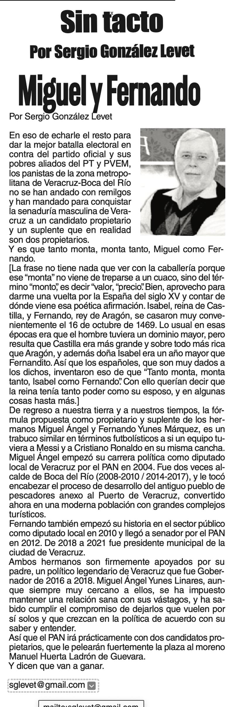 LAS COLUMNAS SIN TACTO - MIGUEL Y FERNANDO MIGUEL Y FERNANDO... 24 enero 2024 Más Noticias LAS COSAS COMO SON | - MAS QUE UN DIARIO... TEXTO IRREVERENTE | LE VA A 'ECHAR GANITAS' - Al parecer, el asunto es 'chimoltrufiar' o sea lo mismo decir una cosa que otra. En marzo, el gobierno estatal informó que el programa de rehabilitación de carreteras y caminos conocido como "Bachetón"... ACERTIJOS | EL QUINTO PARTIDO - En la historia de los mundiales, México nunca ha jugado el quinto partido fuera de casa. Lo más que hemos alcanzado es el cuarto juego y de allí nos mandan a casa… A MIL POR HORA | - **Un matrimonio feliz **Apocalipsis jarocho **La isla de los pedófilos **“Amor con amor se paga”... A MIL POR HORA | - **Chicas más guapas **Días revolcados **Fascinantes artistas **Academia de Ególatras... CANCIONERO | EL PAN Y EL LLORO - Nada es accidental en la política. Este fin de semana, la señora presidente con A de patria tendrá una magna concentración de sus seguidores para celebrar el aniversario... TEXTO IRREVERENTE | ENNOCHEBUENADOS - La mercadotecnia adelanta todo y, ni modo, hay que lidiar con eso. Cuando todavía no acababa noviembre ya se vendían productos navideños y ahora mismo por doquiera se ven locales adornados con ese motivo... SIN TACTO | LAS VÍSPERAS - ¿Se acuerda la memorable lectora? ¿Recuerda el memorioso lector?: “Ya va llegando diciembre y sus posadas. Se va acercando ya también la Navidad. El año nuevo... LAS COSAS COMO SON - VAYA CINISMO... TEXTO IRREVERENTE | AÑO BUENO, AÑO MALO - El 2024 fue un año de suerte y abundancia. Este 2025 ha corrido en su contra con infortunio político y mediático. ¿‘Annus horribilis’? Tal vez no llega a tanto, pero sí desastroso y confirmatorio de sus...