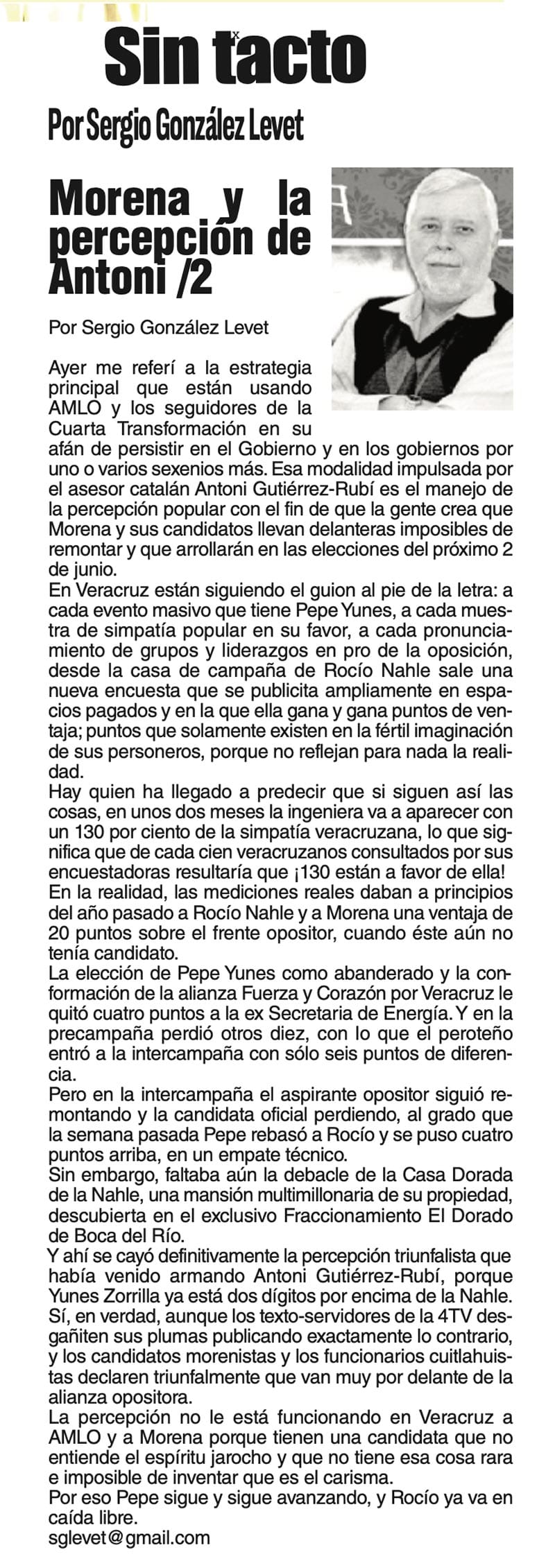 SIN TACTO | MORENA Y LA PERCEPCIÓN DE ANTONI /1 - Como les funcionó la estrategia en las elecciones del año pasado del Estado de México, AMLO y los morenistas decidieron continuar con el mismo asesor...