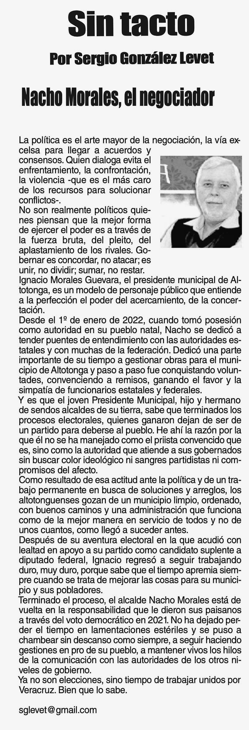 SIN TACTO | NACHO MORALES, EL NEGOCIADOR - La política es el arte mayor de la negociación, la vía excelsa para llegar a acuerdos y consensos. Quien dialoga evita el enfrentamiento, la confrontación, la violencia...