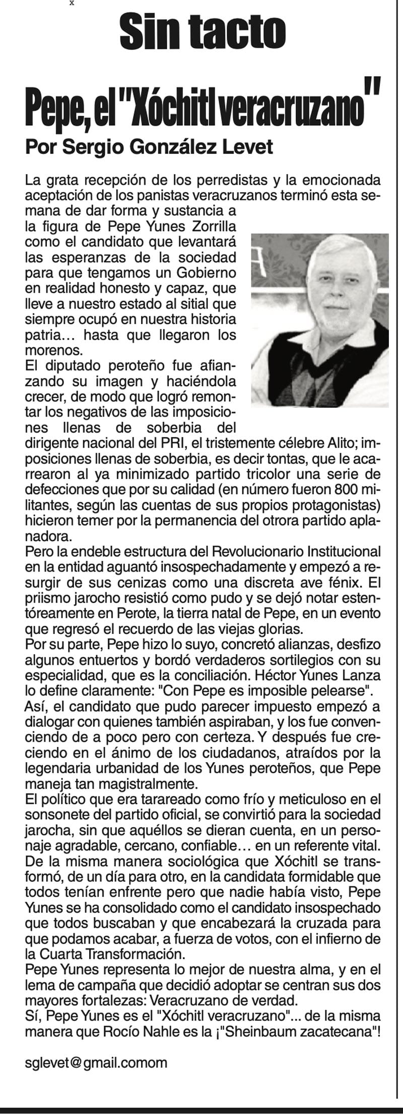 LAS COLUMNAS SIN TACTO - PEPE, EL "XÓCHITL VERACRUZANO" PEPE, EL "XÓCHITL VERACRUZANO" 4 enero 2024 Más Noticias CANCIONERO | EUTANASIA - Yo no tengo particular afecto por los animales llamados de compañía o mascotas, con las que seres solitarios procuran agenciarse afectos mediante el truco del perrito en el parque. Confieso que… A MIL POR HORA | - **Huérfanos mil niños **Hablar mal de Veracruz **Mesianismo jarocho **Fidel Castro en el café... SIN TACTO | SIGUE ZEPETA - En un despido que sigue el canon instaurado por la presidenta Claudia Sheinbaum, la dirigente nacional de Morena, Luisa María Alcalde Luján, fue invitada a ocupar la consejería jurídica de la Presidencia de la... TEXTO IRREVERENTE | ABRAZO FRATERNO - “Dios traerá con Jesús a los que se durmieron en Él” (1 Tesalonicenses 4:13). Desde acá va un abrazo solidario y fraterno para el periodista Luis Velásquez Rivera por la partida de su hermano... ACERTIJOS | LOS TIROTEOS EN LA TELE - Si uno llegara a conocer un nuevo país, suponiendo México, y comenzara a conocerlo y encendiera la tele para revisar el noticiero nocturno, qué bárbaro, pensarían que estamos en un campo de guerra y batalla... ACERTIJOS | LOS 100 AÑOS DE JULIO SCHERER - Julio Scherer García murió en 2015. La unanimidad, esa flor rara, rodeó sus funerales con la corona de la admiración. En estos días cumplió cien años de su nacimiento y la prensa recuperó algo de... A MIL POR HORA | - **Perfil de un mexicano **El jarocho patriota **La lengua más larga **Estilo Porfiriano... SIN TACTO | LA UV DISCRIMINA A JUAN JOSÉ BARRIENTOS - Juan José Barrientos es un ave de tempestades, como corresponde a todo escritor genial. En su larga, larguísima trayectoria literaria ha acumulado estudios y experiencia que se han adjuntado… TEXTO IRREVERENTE | FASCISMO ANTIHUERTISTA - Antes fue deducción, ahora es certeza. Desde el congreso local que dirige Esteban Bautista se financian asambleas y propaganda para denostar al senador Manuel Huerta. Es decir, se utiliza el... CANCIONERO | INTELIGENCIA - No me pidan que sustente la veracidad de lo que voy a escribir enseguida, porque no puedo hacerlo; tampoco voy a proporcionar fuentes de información fidedignas, ni pruebas documentales confiables. No me las pidan...