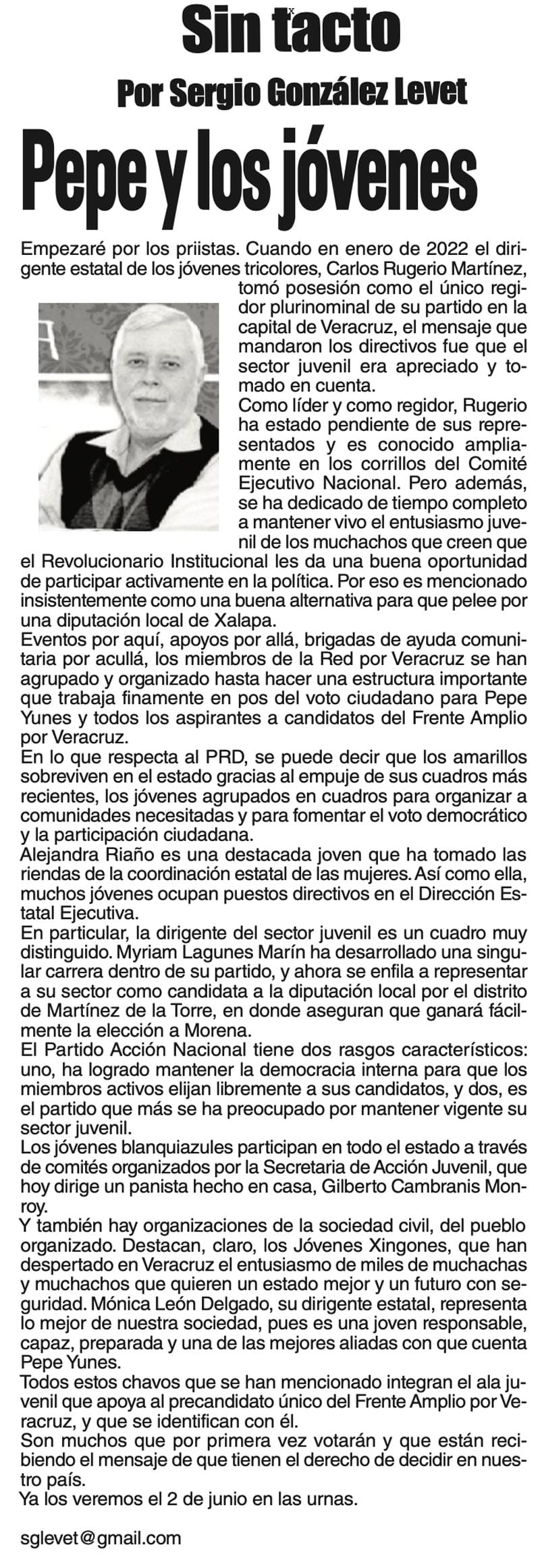 LAS COLUMNAS SIN TACTO - PEPE Y LOS JÓVENES... PEPE Y LOS JÓVENES... 31 enero 2024 Más Noticias TEXTO IRREVERENTE | UN ARTE ETERNO - Envejecer haciendo periodismo no es sinónimo de obsolescencia ni de ser retardatario. La llamada ‘vieja guardia’ de la reporteada y del análisis periodístico... DIARIO DE UN REPORTERO | Y TODO ¿PARA QUÉ? - Tres días estuvo cerrado el centro de Xalapa porque se preparaba el escenario para el primer informe de la gobernadora Rocío Nahle. El tránsito... ACERTIJOS | NACEN LOS RIVALES EN FIFA - Es la mañana del sorteo de FIFA, en Washington, que amanece con un frio del carajo a 2 grados bajo cero y con caída de nieve. Llegan al Kennedy Center… A MIL POR HORA | - **5 películas icónicas **Seniles: bailar en casa **Marilyn y Chanel 5 **Sabroso quesito fundido... LAS COSAS COMO SON | - MAS QUE UN DIARIO... TEXTO IRREVERENTE | LE VA A 'ECHAR GANITAS' - Al parecer, el asunto es 'chimoltrufiar' o sea lo mismo decir una cosa que otra. En marzo, el gobierno estatal informó que el programa de rehabilitación de carreteras y caminos conocido como "Bachetón"... ACERTIJOS | EL QUINTO PARTIDO - En la historia de los mundiales, México nunca ha jugado el quinto partido fuera de casa. Lo más que hemos alcanzado es el cuarto juego y de allí nos mandan a casa… A MIL POR HORA | - **Un matrimonio feliz **Apocalipsis jarocho **La isla de los pedófilos **“Amor con amor se paga”... A MIL POR HORA | - **Chicas más guapas **Días revolcados **Fascinantes artistas **Academia de Ególatras... CANCIONERO | EL PAN Y EL LLORO - Nada es accidental en la política. Este fin de semana, la señora presidente con A de patria tendrá una magna concentración de sus seguidores para celebrar el aniversario...