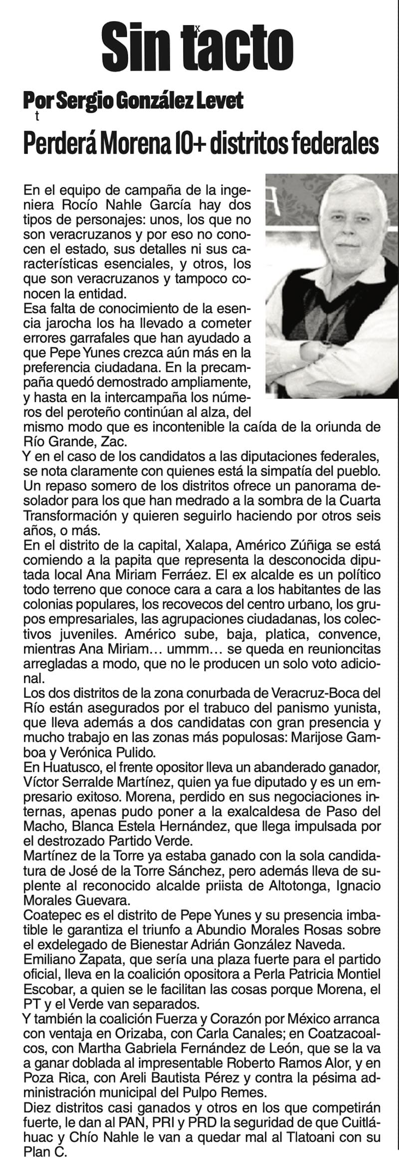 LAS COLUMNAS SIN TACTO | PERDERÁ MORENA 10+ DISTRITOS FEDERALES - En el equipo de campaña de la ingeniera Rocío Nahle García hay dos tipos de personajes... PERDERÁ MORENA 10+ DISTRITOS FEDERALES... 8 marzo 2024 Más Noticias LAS COSAS COMO SON | - MAS QUE UN DIARIO... TEXTO IRREVERENTE | LE VA A 'ECHAR GANITAS' - Al parecer, el asunto es 'chimoltrufiar' o sea lo mismo decir una cosa que otra. En marzo, el gobierno estatal informó que el programa de rehabilitación de carreteras y caminos conocido como "Bachetón"... ACERTIJOS | EL QUINTO PARTIDO - En la historia de los mundiales, México nunca ha jugado el quinto partido fuera de casa. Lo más que hemos alcanzado es el cuarto juego y de allí nos mandan a casa… A MIL POR HORA | - **Un matrimonio feliz **Apocalipsis jarocho **La isla de los pedófilos **“Amor con amor se paga”... A MIL POR HORA | - **Chicas más guapas **Días revolcados **Fascinantes artistas **Academia de Ególatras... CANCIONERO | EL PAN Y EL LLORO - Nada es accidental en la política. Este fin de semana, la señora presidente con A de patria tendrá una magna concentración de sus seguidores para celebrar el aniversario... TEXTO IRREVERENTE | ENNOCHEBUENADOS - La mercadotecnia adelanta todo y, ni modo, hay que lidiar con eso. Cuando todavía no acababa noviembre ya se vendían productos navideños y ahora mismo por doquiera se ven locales adornados con ese motivo... SIN TACTO | LAS VÍSPERAS - ¿Se acuerda la memorable lectora? ¿Recuerda el memorioso lector?: “Ya va llegando diciembre y sus posadas. Se va acercando ya también la Navidad. El año nuevo... LAS COSAS COMO SON - VAYA CINISMO... TEXTO IRREVERENTE | AÑO BUENO, AÑO MALO - El 2024 fue un año de suerte y abundancia. Este 2025 ha corrido en su contra con infortunio político y mediático. ¿‘Annus horribilis’? Tal vez no llega a tanto, pero sí desastroso y confirmatorio de sus...