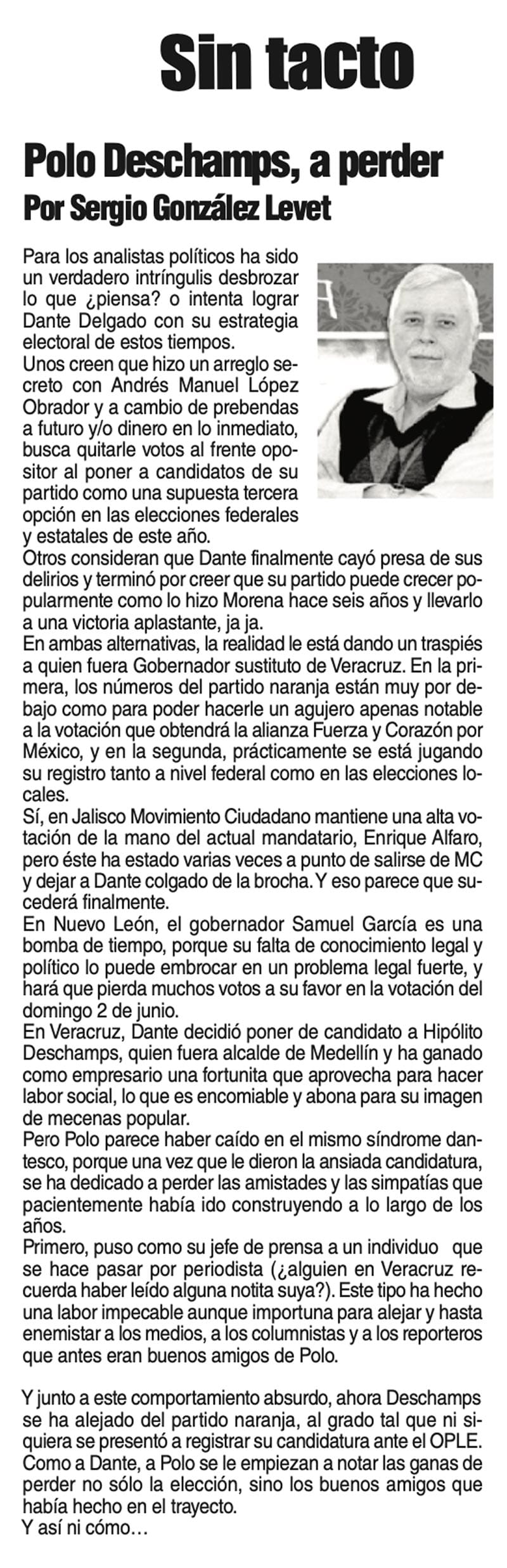 SIN TACTO | POLO DESCHAMPS, A PERDER - Para los analistas políticos ha sido un verdadero intríngulis desbrozar lo que ¿piensa? o intenta lograr Dante Delgado con su estrategia electoral de estos tiempos...