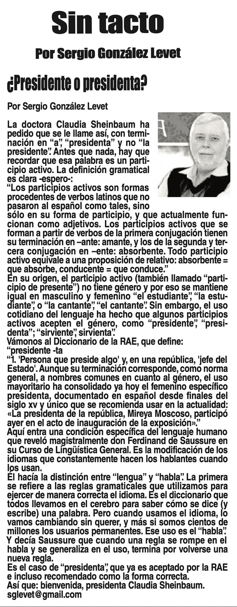 SIN TACTO | ¿PRESIDENTE O PRESIDENTA? - La doctora Claudia Sheinbaum ha pedido que se le llame asi, con terminación en "a" "presidenta" y no "la presidente Antes que nada, hay que recordar que esa palabra es un participio activo...