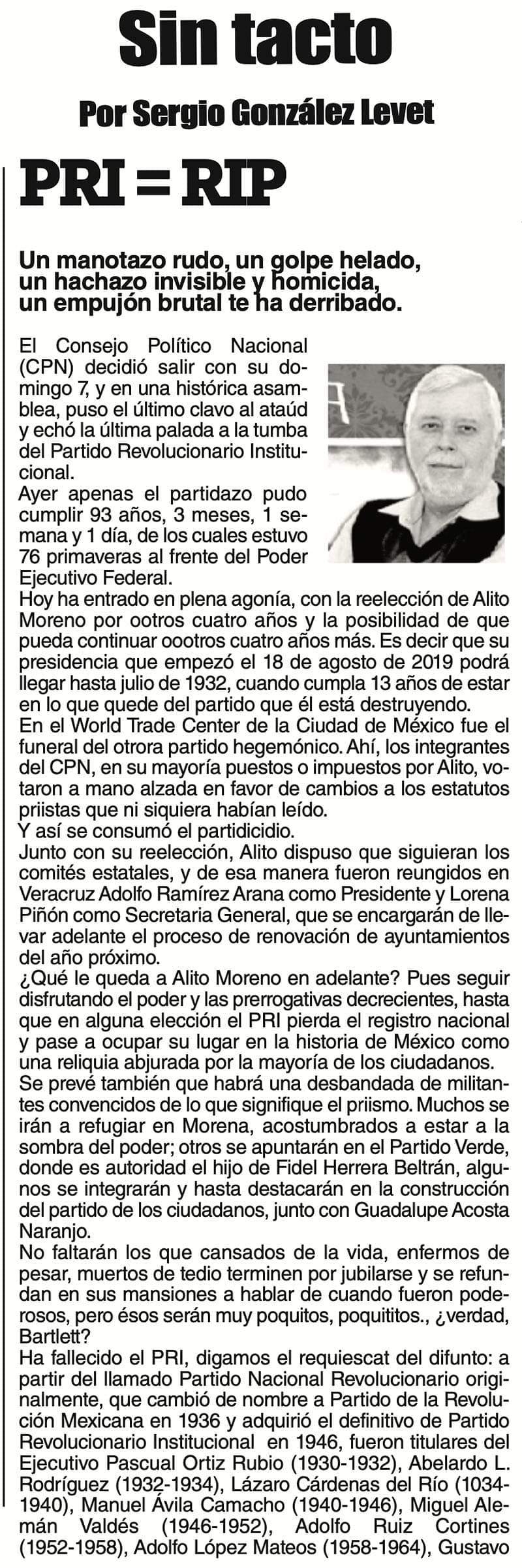 SIN TACTO | PRI = RIP - El Consejo Político Nacional (CPN) decidió salir con su domingo 7, y en una histórica asamblea, puso el último clavo al ataúd y echó la última palada a la tumba del Partido Revolucionario Institucional...