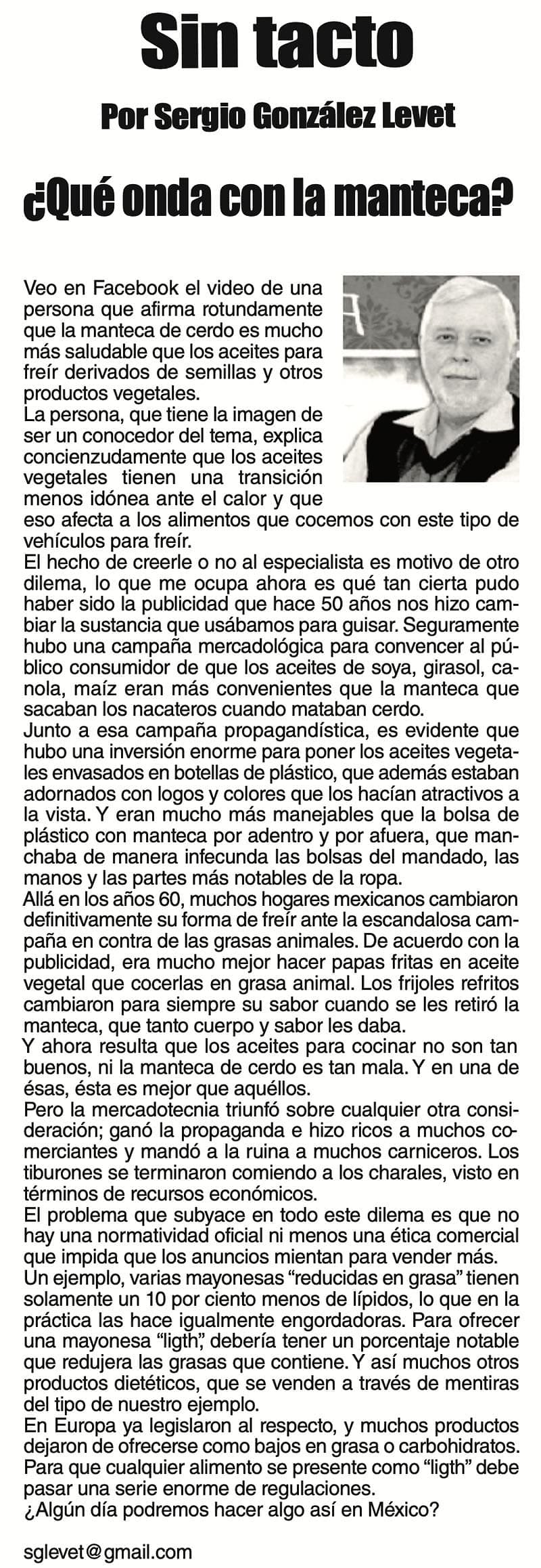 SIN TACTO | ¿QUÉ ONDA CON LA MANTECA? - Veo en Facebook el video de una persona que afirma rotundamente que la manteca de cerdo es mucho más saludable que los aceites para freír derivados de semillas y otros productos vegetales...