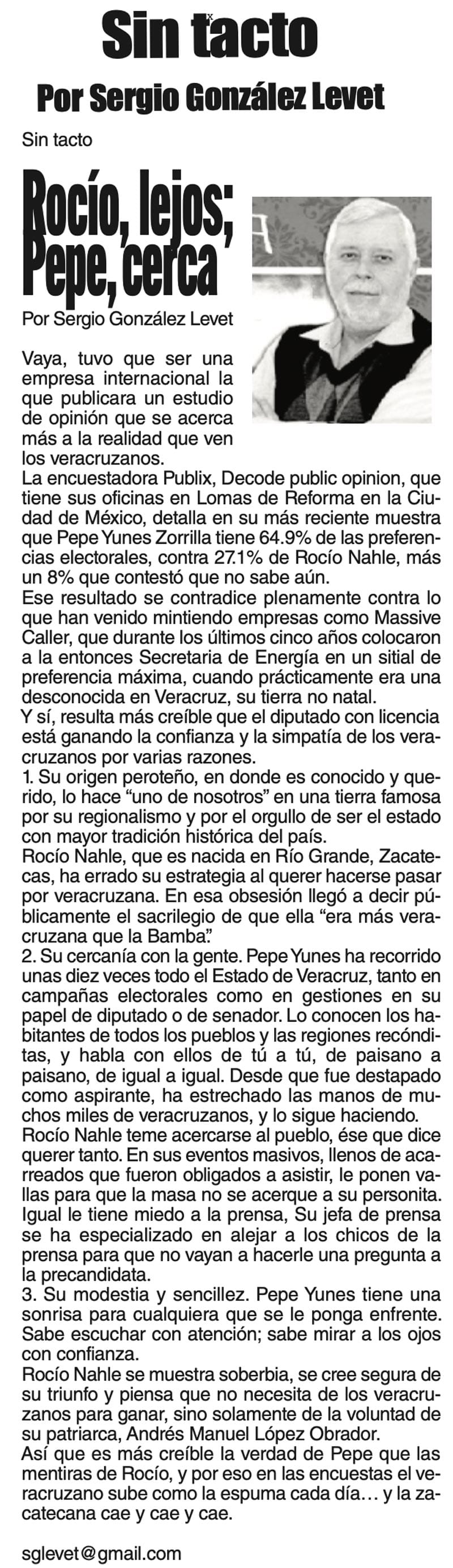 LAS COLUMNAS SIN TACTO - ROCÍO, LEJOS; PEPE, CERCA... ROCÍO, LEJOS; PEPE, CERCA... 11 enero 2024 Más Noticias LAS COSAS COMO SON | - MAS QUE UN DIARIO... TEXTO IRREVERENTE | LE VA A 'ECHAR GANITAS' - Al parecer, el asunto es 'chimoltrufiar' o sea lo mismo decir una cosa que otra. En marzo, el gobierno estatal informó que el programa de rehabilitación de carreteras y caminos conocido como "Bachetón"... ACERTIJOS | EL QUINTO PARTIDO - En la historia de los mundiales, México nunca ha jugado el quinto partido fuera de casa. Lo más que hemos alcanzado es el cuarto juego y de allí nos mandan a casa… A MIL POR HORA | - **Un matrimonio feliz **Apocalipsis jarocho **La isla de los pedófilos **“Amor con amor se paga”... A MIL POR HORA | - **Chicas más guapas **Días revolcados **Fascinantes artistas **Academia de Ególatras... CANCIONERO | EL PAN Y EL LLORO - Nada es accidental en la política. Este fin de semana, la señora presidente con A de patria tendrá una magna concentración de sus seguidores para celebrar el aniversario... TEXTO IRREVERENTE | ENNOCHEBUENADOS - La mercadotecnia adelanta todo y, ni modo, hay que lidiar con eso. Cuando todavía no acababa noviembre ya se vendían productos navideños y ahora mismo por doquiera se ven locales adornados con ese motivo... SIN TACTO | LAS VÍSPERAS - ¿Se acuerda la memorable lectora? ¿Recuerda el memorioso lector?: “Ya va llegando diciembre y sus posadas. Se va acercando ya también la Navidad. El año nuevo... LAS COSAS COMO SON - VAYA CINISMO... TEXTO IRREVERENTE | AÑO BUENO, AÑO MALO - El 2024 fue un año de suerte y abundancia. Este 2025 ha corrido en su contra con infortunio político y mediático. ¿‘Annus horribilis’? Tal vez no llega a tanto, pero sí desastroso y confirmatorio de sus...
