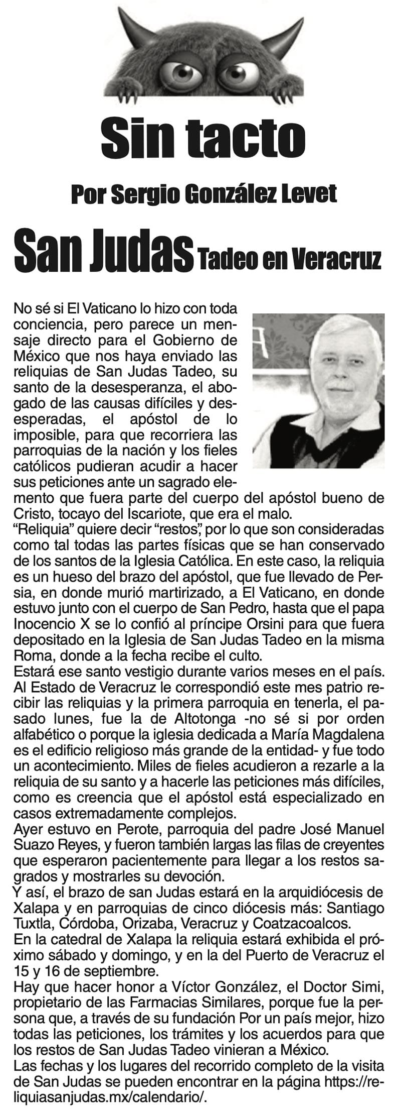 SIN TACTO | SAN JUDAS TADEO EN VERACRUZ - No sé si El Vaticano lo hizo con toda conciencia, pero parece un mensaje directo para el Gobierno de México que nos haya enviado las reliquias de San Judas Tadeo, su santo...