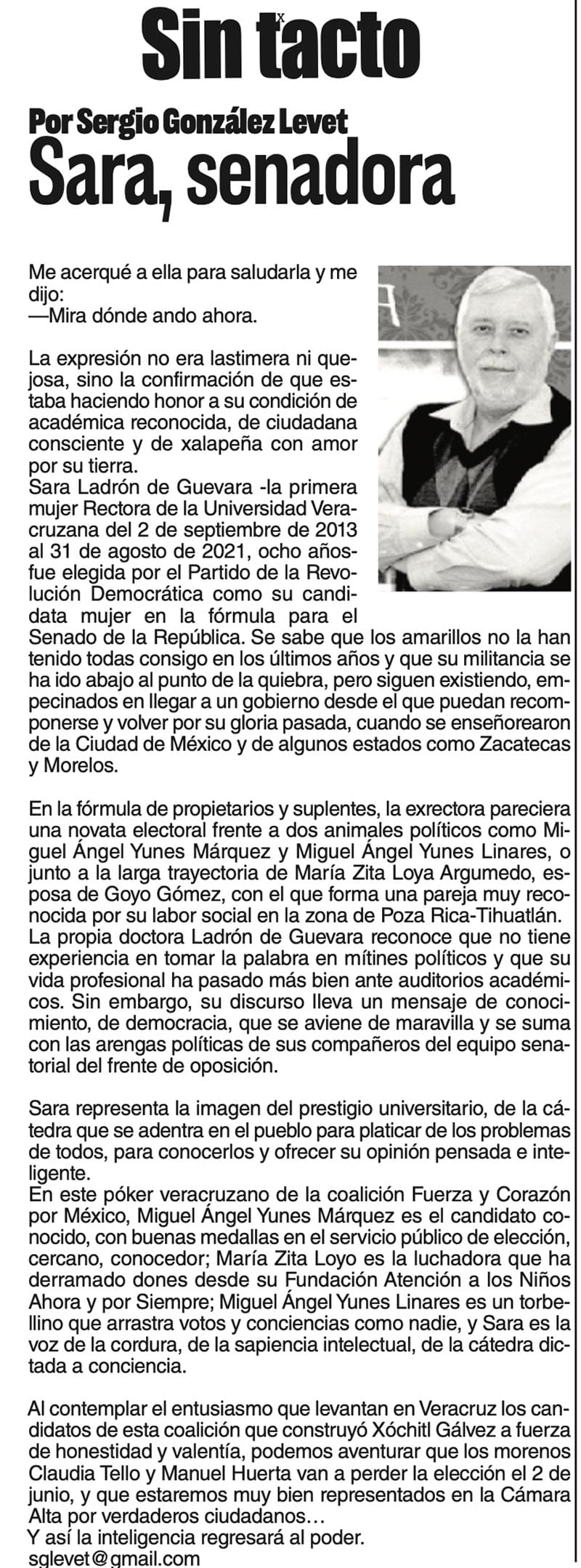 LAS COLUMNAS SIN TACTO | SARA, SENADORA - Me acerqué a ella para saludarla y me dijo: -Mira dónde ando ahora. La expresión no era lastimera ni quejosa... SARA, SENADORA... 5 marzo 2024 Más Noticias CANCIONERO | PIRATAS DEL CARIBE - A la pregunta de qué va a hacer con el petróleo que llevaba el barco tanque grandote llamado Skipper y con bandera falsa de Guyana, que sus fuerzas armadas... ACERTIJOS | LOS 51 AÑOS DE NOTIVER - Allá por los años 70s nacía Notiver. Un día Guadalupano por un asunto de festejo familiar. Desde aquel día de hace 51 años, que este 12 de diciembre se cumplen, el diario... TEXTO IRREVERENTE | - Monumental, mágico, misterioso y meritorio. Así definen arqueólogos y antropólogos a El Tajín, la ciudad prehispánica que se ubica cerca de Papantla, al norte veracruzano... A MIL POR HORA | - **Los duendes existen **Honrar al IMSS **Comadrita traviesa **Javier Duarte seguirá preso... TEXTO IRREVERENTE | CINCUENTA + UNO - La familia notiveriana está velando vísperas pues mañana es su fiesta magna, la que tiene lugar cada fin de otoño, ya pisando el invierno. El cumpleaños de NOTIVER comparte fecha... CANCIONERO | EL GOZO AL POZO...DE AGUA - Muy pronto se apagó el argüende mediático armado desde Palacio Nacional, en torno a la señora presidente con A de patria, celebrando con sonrisa pareja del primer ministro de Canadá, el bailoteo al ritmo de YMCA... SIN TACTO | 4T, LAS CUENTAS ALEGRES - Bueno, cuando menos podemos aceptar que los morenos en el poder tienen una capacidad: seguir al pie de la letra las instrucciones del librito que indica cómo responder y qué decir… ACERTIJOS | POR LOS 51 DE NOTIVER - Un día antes auguraban un gran Norte, que entró en lunes. Al iniciar semana. Cotidianamente llegó con mi hermano Enrique, con Fernando Pavón, biógrafo de Tierra Blanca y el amigo... 51 Y CONTANDO… | - Medio siglo y un año, no se escribe ni fácil ni sin derramar una que otra lagrimilla: 51 años de éste su periódico NOTIVER. La Noticia en el momento que sucede, es un acontecimiento más... A MIL POR HORA | - **Migrante exitoso **Genio universal **Manipulador de mujeres **Ley vs vapeadores...