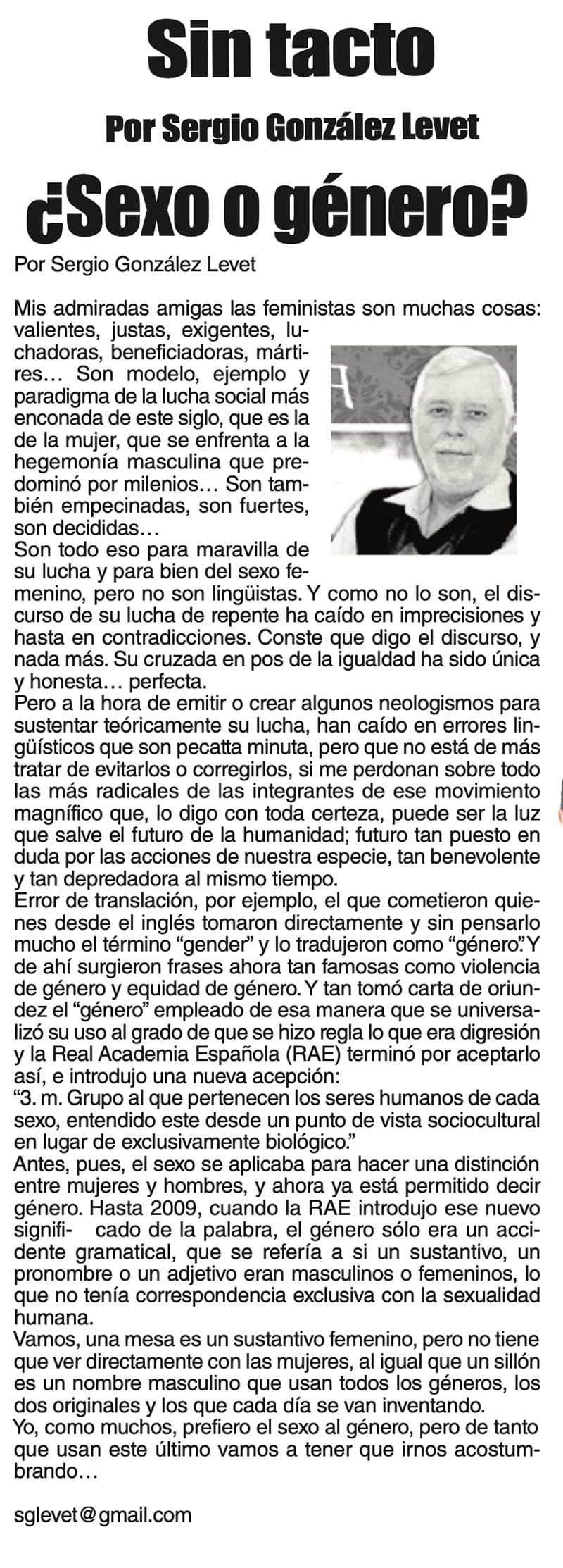 SIN TACTO | ¿SEXO O GÉNERO? - Mis admiradas amigas las feministas son muchas cosas: valientes, justas, exigentes, luchadoras, beneficiadoras, mártires... Son modelo, ejemplo y paradigma de la lucha social más enconada...