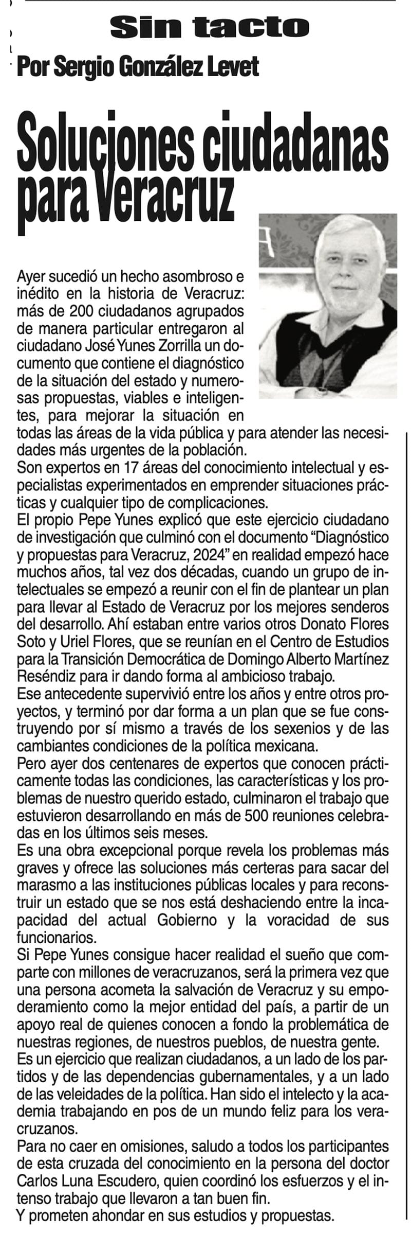 SIN TACTO | SOLUCIONES CIUDADANAS PARA VERACRUZ - Ayer sucedió un hecho asombroso e inédito en la historia de Veracruz: más de 200 ciudadanos agrupados de manera particular entregaron al ciudadano José Yunes Zorrilla un documento...