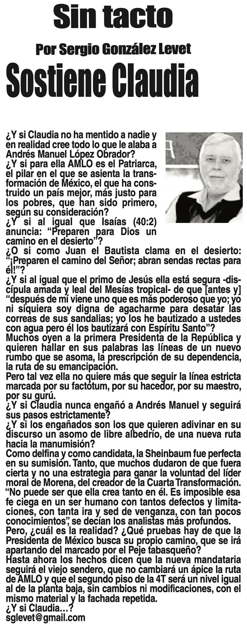 SIN TACTO | SOSTIENE CLAUDIA - ¿Y si Claudia no ha mentido a nadie y en realidad cree todo lo que le alaba a Andrés Manuel López Obrador? ¿Y si para ella AMLO es el Patriarca, el pilar en el que se asienta...