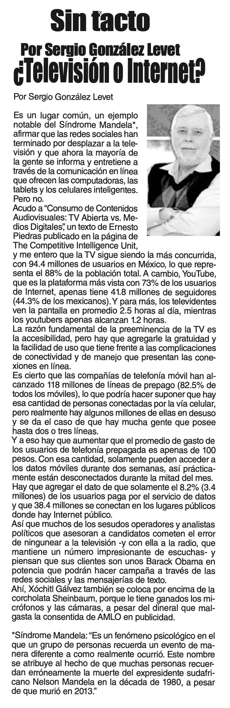 LAS COLUMNAS SIN TACTO -¿TELEVISIÓN O INTERNET? ¿TELEVISIÓN O INTERNET?... 24 octubre 2023 Más Noticias A MIL POR HORA | - **Chicas más guapas **Días revolcados **Fascinantes artistas **Academia de Ególatras... CANCIONERO | EL PAN Y EL LLORO - Nada es accidental en la política. Este fin de semana, la señora presidente con A de patria tendrá una magna concentración de sus seguidores para celebrar el aniversario... TEXTO IRREVERENTE | ENNOCHEBUENADOS - La mercadotecnia adelanta todo y, ni modo, hay que lidiar con eso. Cuando todavía no acababa noviembre ya se vendían productos navideños y ahora mismo por doquiera se ven locales adornados con ese motivo... SIN TACTO | LAS VÍSPERAS - ¿Se acuerda la memorable lectora? ¿Recuerda el memorioso lector?: “Ya va llegando diciembre y sus posadas. Se va acercando ya también la Navidad. El año nuevo... LAS COSAS COMO SON - VAYA CINISMO... TEXTO IRREVERENTE | AÑO BUENO, AÑO MALO - El 2024 fue un año de suerte y abundancia. Este 2025 ha corrido en su contra con infortunio político y mediático. ¿‘Annus horribilis’? Tal vez no llega a tanto, pero sí desastroso y confirmatorio de sus... SIN TACTO | ¿PORRAS A NOROÑA? - El cada vez más impresentable y alocado Gerardo Fernández Noroña le hizo el dudoso honor y el muy flaco favor a la gobernadora Rocío Nahle… ACERTIJOS | - Decía un gran columnista, que aunque fuera día de celebración o de cumple o de lo que sea, nunca hay que dejar de teclear algo, para seguir activos. Hoy es mi cumple... CANCIONERO | EL FISCAL INCÓMODO - Nadie pudo imaginar que un incidente en el concurso de Miss Universo, esa feria machista de la carne y la lascivia, disfrazada del más pueril nacionalismo, fuera a… A MIL POR HORA | - **Un día feliz **Amores prohibidos **$350 mil de recompensas **La política más joven...