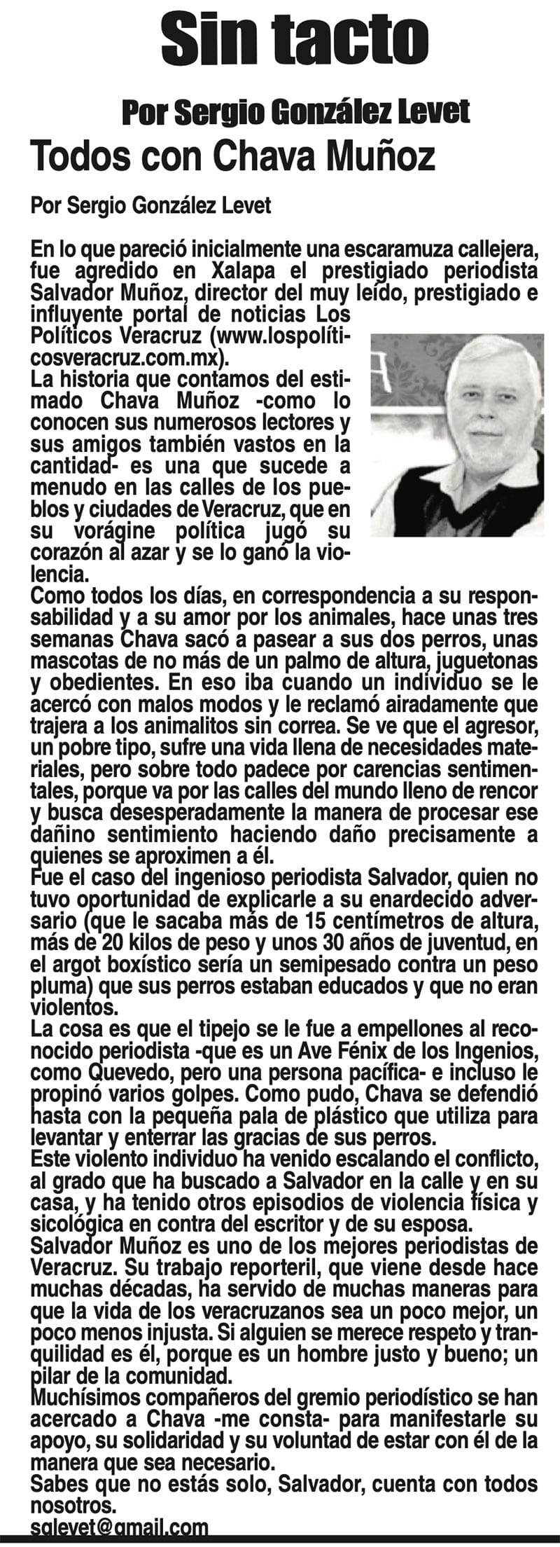 SIN TACTO | TODOS CON CHAVA MUÑOZ - En lo que pareció inicialmente una escaramuza callejera, fue agredido en Xalapa el prestigiado periodista Salvador Muñoz, director del muy leído, prestigiado e influyente...