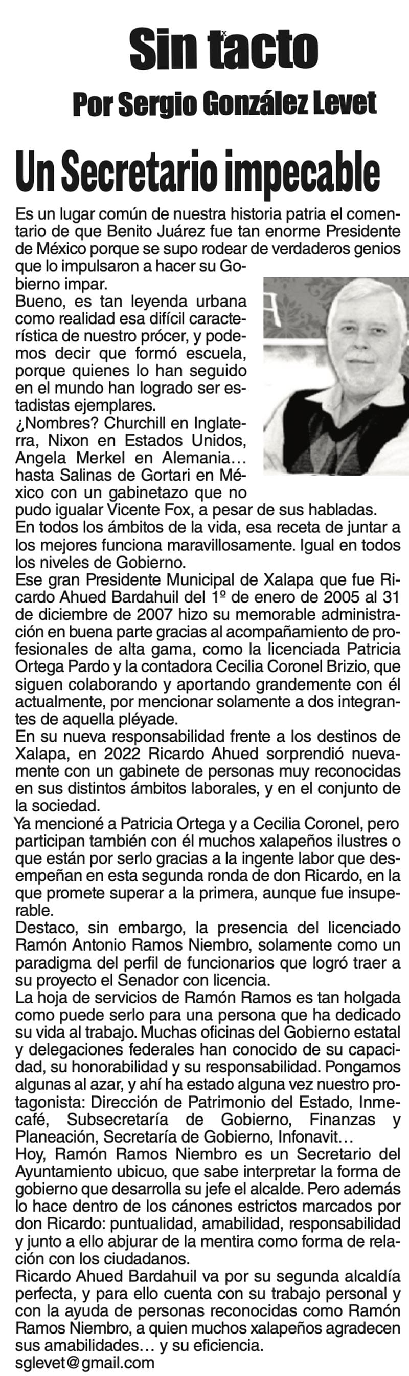 LAS COLUMNAS SIN TACTO - UN SECRETARIO IMPECABLE- ES UN LUGAR COMÚN DE NUESTRA HISTORIA PATRIA EL COMENTARIO DE QUE BENITO JUÁREZ FUE TAN ENORME PRESIDENTE... UN SECRETARIO IMPECABLE... 18 enero 2024 Más Noticias TEXTO IRREVERENTE | UN ARTE ETERNO - Envejecer haciendo periodismo no es sinónimo de obsolescencia ni de ser retardatario. La llamada ‘vieja guardia’ de la reporteada y del análisis periodístico... DIARIO DE UN REPORTERO | Y TODO ¿PARA QUÉ? - Tres días estuvo cerrado el centro de Xalapa porque se preparaba el escenario para el primer informe de la gobernadora Rocío Nahle. El tránsito... ACERTIJOS | NACEN LOS RIVALES EN FIFA - Es la mañana del sorteo de FIFA, en Washington, que amanece con un frio del carajo a 2 grados bajo cero y con caída de nieve. Llegan al Kennedy Center… A MIL POR HORA | - **5 películas icónicas **Seniles: bailar en casa **Marilyn y Chanel 5 **Sabroso quesito fundido... LAS COSAS COMO SON | - MAS QUE UN DIARIO... TEXTO IRREVERENTE | LE VA A 'ECHAR GANITAS' - Al parecer, el asunto es 'chimoltrufiar' o sea lo mismo decir una cosa que otra. En marzo, el gobierno estatal informó que el programa de rehabilitación de carreteras y caminos conocido como "Bachetón"... ACERTIJOS | EL QUINTO PARTIDO - En la historia de los mundiales, México nunca ha jugado el quinto partido fuera de casa. Lo más que hemos alcanzado es el cuarto juego y de allí nos mandan a casa… A MIL POR HORA | - **Un matrimonio feliz **Apocalipsis jarocho **La isla de los pedófilos **“Amor con amor se paga”... A MIL POR HORA | - **Chicas más guapas **Días revolcados **Fascinantes artistas **Academia de Ególatras... CANCIONERO | EL PAN Y EL LLORO - Nada es accidental en la política. Este fin de semana, la señora presidente con A de patria tendrá una magna concentración de sus seguidores para celebrar el aniversario...