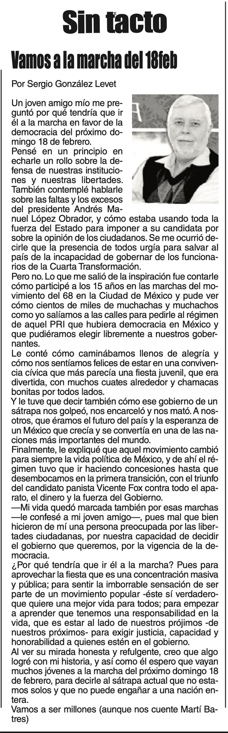 LAS COLUMNAS SIN TACTO | VAMOS A LA MARCHA DEL 18FEB - Un joven amigo mío me preguntó por qué tendría que ir él a la marcha a favor de la democracia del próximo domingo... VAMOS A LA MARCHA DEL 18FEB... 15 febrero 2024 Más Noticias LAS COSAS COMO SON - PARA TI... DIARIO DE UN REPORTERO | OCURRENCIAS - De cuando en cuando, el gobierno de Veracruz – es decir, la gobernadora Rocío Nahle – anuncia planes y proyectos, y sus aplaudidores celebran los anuncios como si fueran hechos consumados. Pero… TEXTO IRREVERENTE | EL NEGRO JOSÉ - Comenzaron los afrocarnavales en Veracruz, son ocho aunque eran nueve pero uno se pervirtió políticamente y al final desapareció. Aún así, los que restan son joyas culturales pese a estar olvidadas por las... A MIL POR HORA | - **103 años de artista **Trump se enriquece **Nepotismo en Morena **Primer mujer decapitada... A MIL POR HORA | - **¡Ay, tiempos aquellos! **Ciudades en la Luna **Jarocho víctima en E.U. **Huir de Veracruz CANCIONERO | ARTE NUMÉRICA - Puede ser que a alguien le interese, pero me puse a buscar cuántas personas mueren violentamente, es decir, son asesinadas, cada día en España, que afortunadamente sigue siendo un referente cultural, étnico y social para... LAS COSAS COMO SON - EL DANZÓN... SIN TACTO | ERIC LARA Y LA OSTRA - Si usted de casualidad anda por Martínez de la Torre y se enfila en la carretera hacia San Rafael no va a tener más remedio que detenerse a desayunar o a comer o a cenar, según, en el maravilloso lugar que mantiene y... SIN TACTO | ABUELITAS - Yo, es un decir, abuelita paterna no tuve. Doña Julia Cervantes murió de una pulmonía mal tratada cuando mi padre apenas tenía cinco años. Así que de ella sólo tuve un recuerdo borroso y lejano, equilibrado por el dato... LAS COSAS COMO SON - CLASE DE HISTORIA...