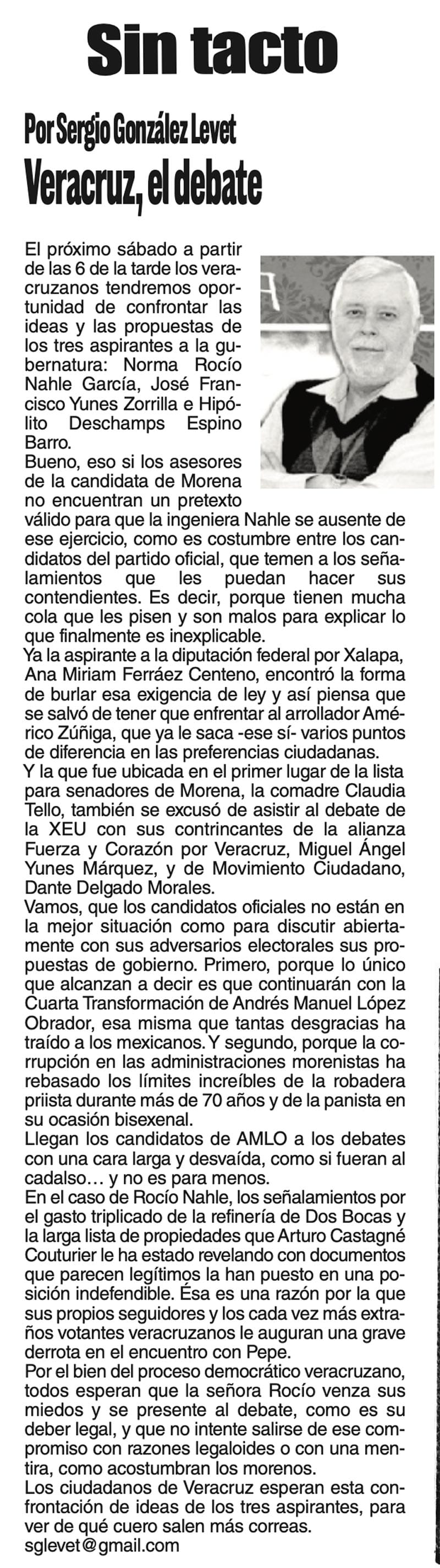 SIN TACTO | VERACRUZ, EL DEBATE - El próximo sábado a partir de las 6 de la tarde los veracruzanos tendremos oportunidad de confrontar las ideas y las propuestas de los tres aspirantes...
