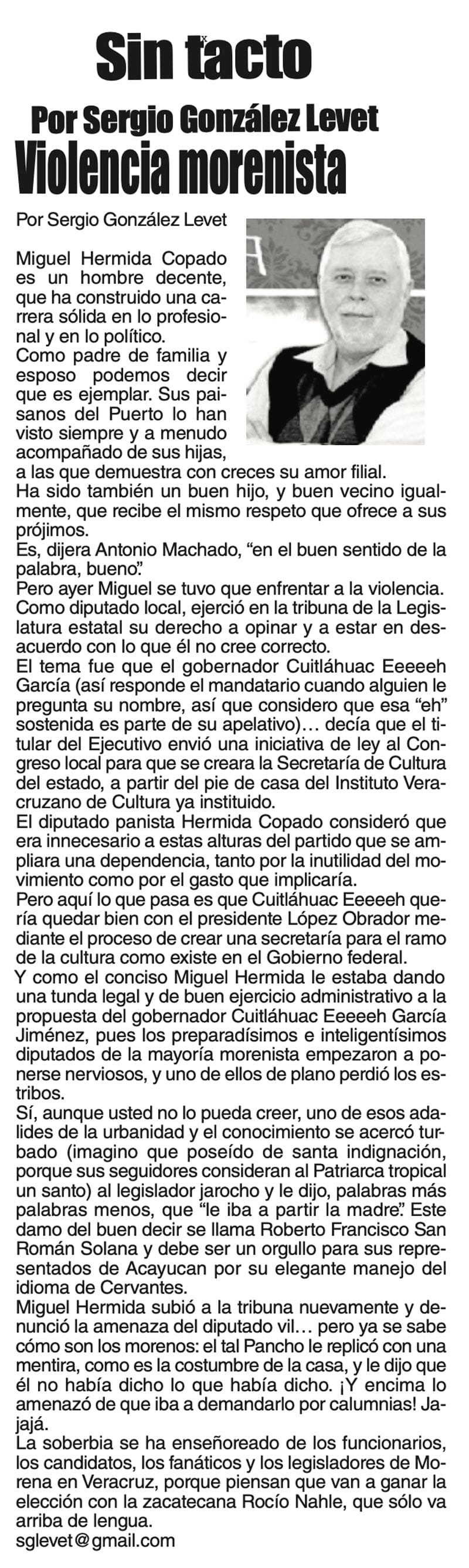 LAS COLUMNAS SIN TACTO - VIOLENCIA MORENISTA VIOLENCIA MORENISTA... 12 enero 2024 Más Noticias ACERTIJOS | QUE NO SE NOS OLVIDE (DISCURSO HIJA DE MARIA CORINA MACHADO/OSLO) - “Cuando comprendimos cuán frágiles se habían vuelto nuestras instituciones, ya era tarde. El cabecilla de un golpe militar contra la democracia fue elegido presidente... A MIL POR HORA | - **¿Estás conmigo o Vs. mí? **Cura para el Alzheimer **Zeus, dios querendón… **Clóset de Nahle CANCIONERO | SANTA CLAUS IS COMING TO TOWN - Yo sé que es mucho pedir, mucho más para un infiel como debo ser considerado en la Santa Iglesia Católica, Apostólica y Romana, sugerirle al Todopoderoso que -en su omnipotencia- me hiciera Papa de su iglesia… TEXTO IRREVERENTE | UN OSCURO DEL PASADO - Más temprano que tarde están confirmándose los augurios azarosos para la Fiscalía General de Justicia (FGJ) con la imposición de la 'bolaochista'-cuitlahuista Aurelia Jiménez quien... LAS COSAS COMO SON - ESTARIA CREMADO... SIN TACTO | 51… Y MÁS - Hace un año y tres días, Notiver celebró su medio siglo de ser el periódico que los jarochos necesitaban y que han disfrutado al máximo. 19,230 días en que el periódico ha estado saliendo... CANCIONERO | PIRATAS DEL CARIBE - A la pregunta de qué va a hacer con el petróleo que llevaba el barco tanque grandote llamado Skipper y con bandera falsa de Guyana, que sus fuerzas armadas... ACERTIJOS | LOS 51 AÑOS DE NOTIVER - Allá por los años 70s nacía Notiver. Un día Guadalupano por un asunto de festejo familiar. Desde aquel día de hace 51 años, que este 12 de diciembre se cumplen, el diario... TEXTO IRREVERENTE | - Monumental, mágico, misterioso y meritorio. Así definen arqueólogos y antropólogos a El Tajín, la ciudad prehispánica que se ubica cerca de Papantla, al norte veracruzano... A MIL POR HORA | - **Los duendes existen **Honrar al IMSS **Comadrita traviesa **Javier Duarte seguirá preso...