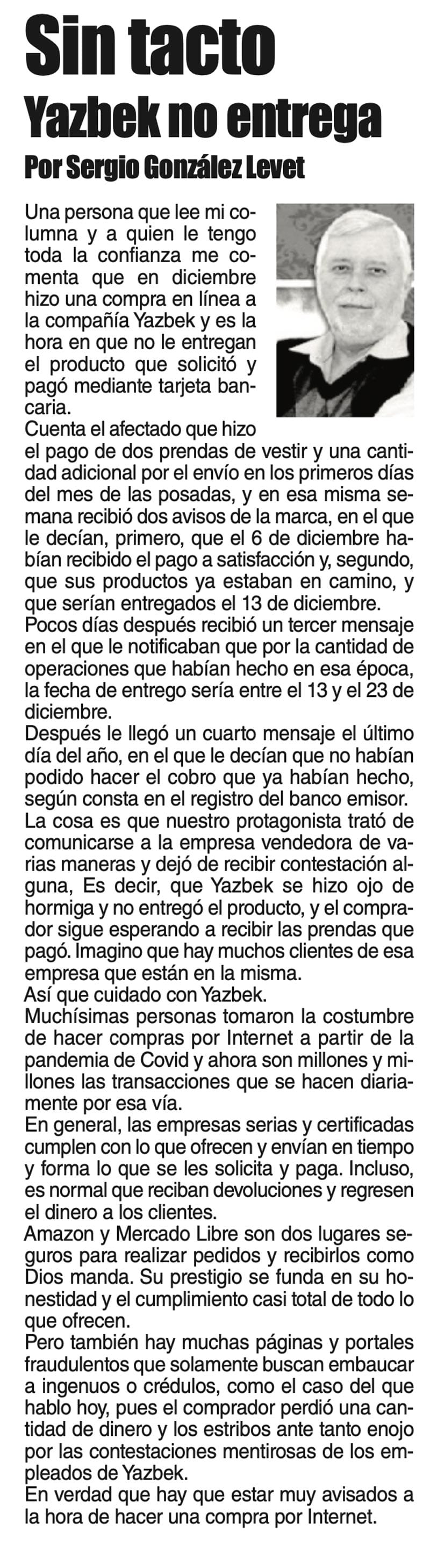 SIN TACTO | YAZBEK NO ENTREGA - Una persona que lee mi columna y a quien le tengo toda la confianza me comenta que en diciembre hizo una compra en línea a la compañía Yazbek y es la hora en que no le entregan el producto...