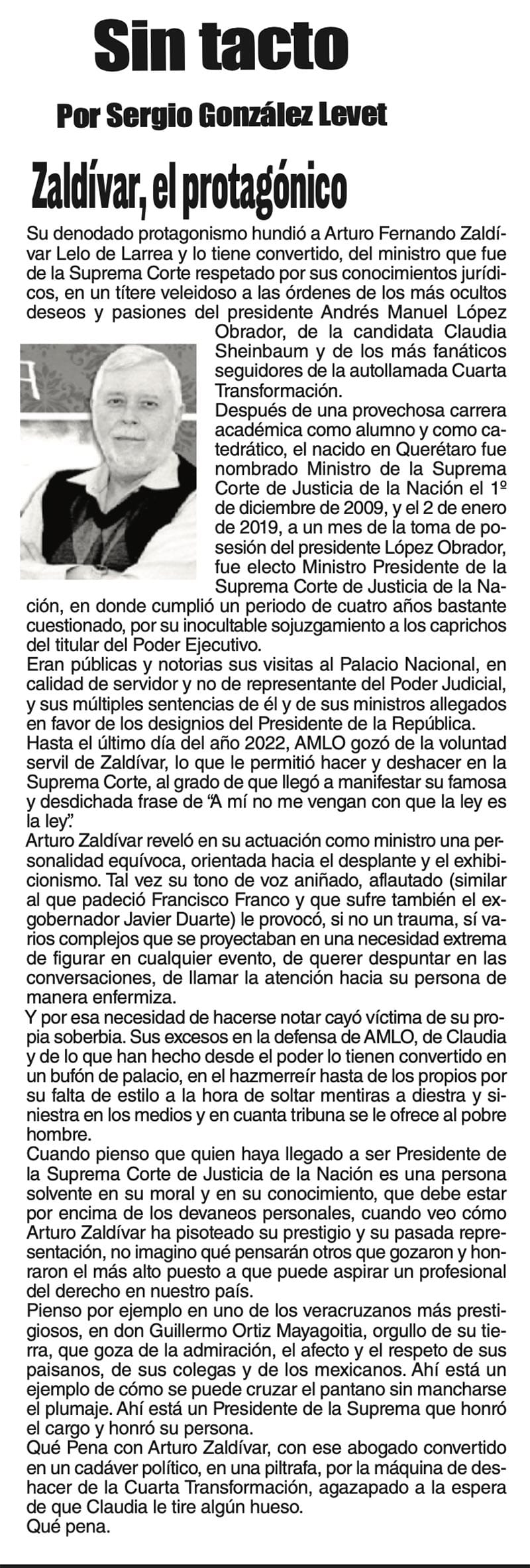 SIN TACTO | ZALDÍVAR, EL PROTAGÓNICO - Su denodado protagonismo hundió a Arturo Fernado Zaldívar Lelo de Larrea y lo tiene convertido, del ministro que fue de la Suprema Corte...