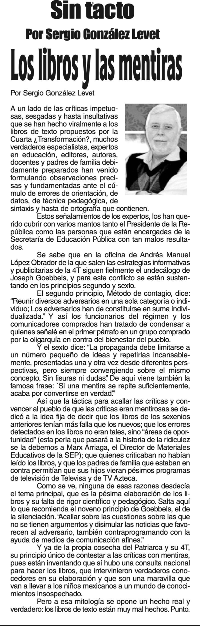 LAS COLUMNAS SIN TACTO LOS LIBROS Y LAS MENTIRAS 14 agosto 2023 Más Noticias CANCIONERO | PIRATAS DEL CARIBE - A la pregunta de qué va a hacer con el petróleo que llevaba el barco tanque grandote llamado Skipper y con bandera falsa de Guyana, que sus fuerzas armadas... ACERTIJOS | LOS 51 AÑOS DE NOTIVER - Allá por los años 70s nacía Notiver. Un día Guadalupano por un asunto de festejo familiar. Desde aquel día de hace 51 años, que este 12 de diciembre se cumplen, el diario... TEXTO IRREVERENTE | - Monumental, mágico, misterioso y meritorio. Así definen arqueólogos y antropólogos a El Tajín, la ciudad prehispánica que se ubica cerca de Papantla, al norte veracruzano... A MIL POR HORA | - **Los duendes existen **Honrar al IMSS **Comadrita traviesa **Javier Duarte seguirá preso... TEXTO IRREVERENTE | CINCUENTA + UNO - La familia notiveriana está velando vísperas pues mañana es su fiesta magna, la que tiene lugar cada fin de otoño, ya pisando el invierno. El cumpleaños de NOTIVER comparte fecha... CANCIONERO | EL GOZO AL POZO...DE AGUA - Muy pronto se apagó el argüende mediático armado desde Palacio Nacional, en torno a la señora presidente con A de patria, celebrando con sonrisa pareja del primer ministro de Canadá, el bailoteo al ritmo de YMCA... SIN TACTO | 4T, LAS CUENTAS ALEGRES - Bueno, cuando menos podemos aceptar que los morenos en el poder tienen una capacidad: seguir al pie de la letra las instrucciones del librito que indica cómo responder y qué decir… ACERTIJOS | POR LOS 51 DE NOTIVER - Un día antes auguraban un gran Norte, que entró en lunes. Al iniciar semana. Cotidianamente llegó con mi hermano Enrique, con Fernando Pavón, biógrafo de Tierra Blanca y el amigo... 51 Y CONTANDO… | - Medio siglo y un año, no se escribe ni fácil ni sin derramar una que otra lagrimilla: 51 años de éste su periódico NOTIVER. La Noticia en el momento que sucede, es un acontecimiento más... A MIL POR HORA | - **Migrante exitoso **Genio universal **Manipulador de mujeres **Ley vs vapeadores...