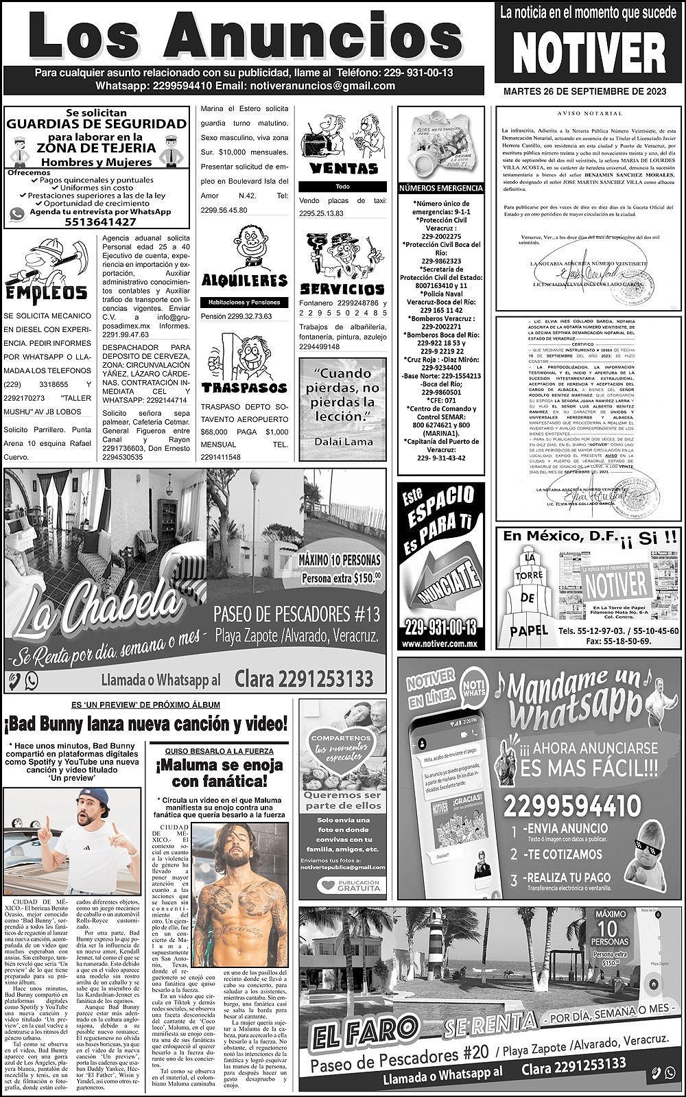 LOS ANUNCIOS ...LOS ANUNCIOS, AVISOS Y DEMÁS! - MARTES, 26 DE SEPTIEMBRE 2023 LOS ANUNCIOS, AVISOS Y DEMÁS! - MARTES, 26 DE SEPTIEMBRE 2023 26 septiembre 2023 Cotice su Anuncio Su Correo Electrónico: Texto: Enviar