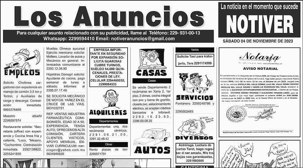 LOS ANUNCIOS ...LOS ANUNCIOS, AVISOS Y DEMÁS! - SÁBADO, 4 DE NOVIEMBRE 2023 LOS ANUNCIOS, AVISOS Y DEMÁS! - SÁBADO, 4 DE NOVIEMBRE 2023 4 noviembre 2023 Cotice su Anuncio Su Correo Electrónico: Texto: Enviar