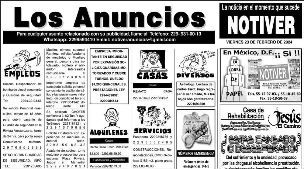 LOS ANUNCIOS ...LOS ANUNCIOS, AVISOS Y DEMÁS! - VIERNES, 23 DE FEBRERO 2024 LOS ANUNCIOS, AVISOS Y DEMÁS! - VIERNES, 23 DE FEBRERO 2024... 23 febrero 2024 Cotice su Anuncio Su Correo Electrónico: Texto: Enviar