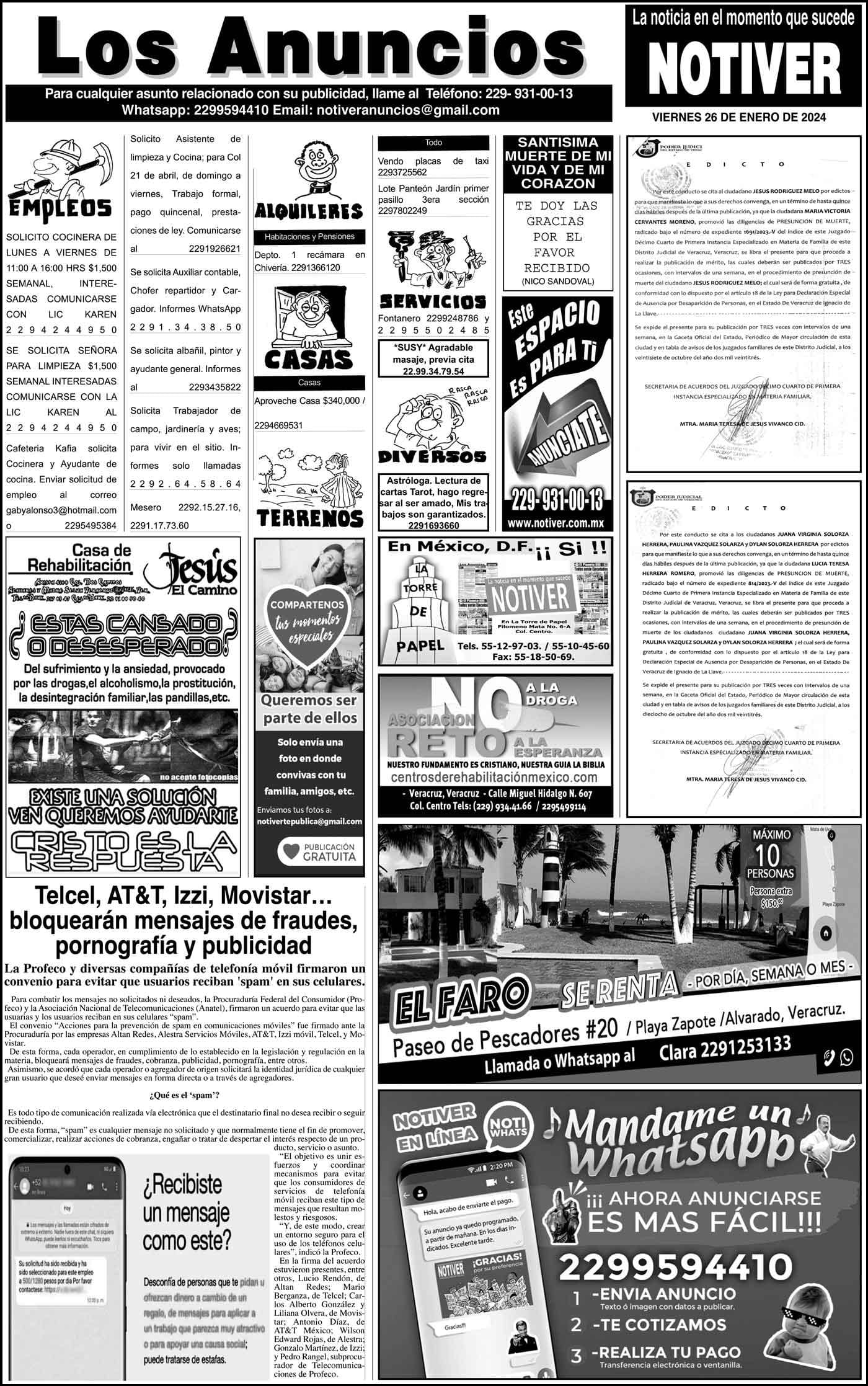 LOS ANUNCIOS ...LOS ANUNCIOS, AVISOS Y DEMÁS! - VIERNES, 26 DE ENERO 2024 LOS ANUNCIOS, AVISOS Y DEMÁS! - VIERNES, 26 DE ENERO 2024... 26 enero 2024 Cotice su Anuncio Su Correo Electrónico: Texto: Enviar