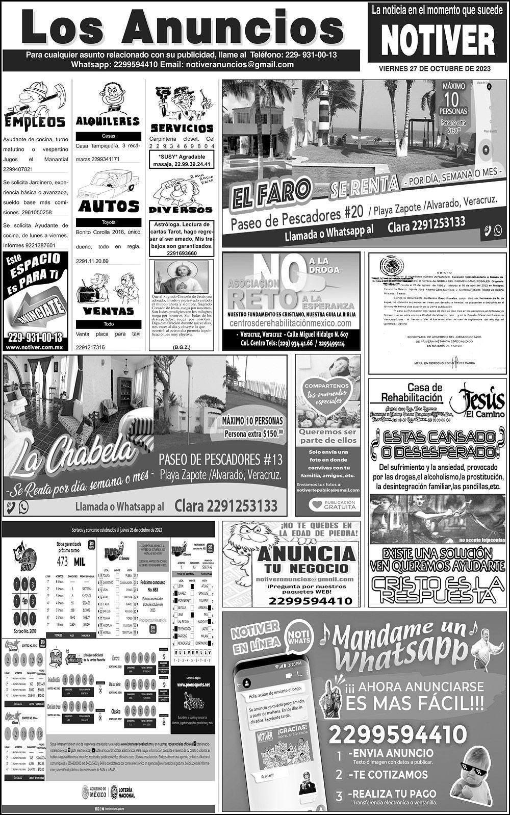 LOS ANUNCIOS ...LOS ANUNCIOS, AVISOS Y DEMÁS! - VIERNES, 27 DE OCTUBRE 2023 LOS ANUNCIOS, AVISOS Y DEMÁS! - VIERNES, 27 DE OCTUBRE 2023 27 octubre 2023 Cotice su Anuncio Su Correo Electrónico: Texto: Enviar