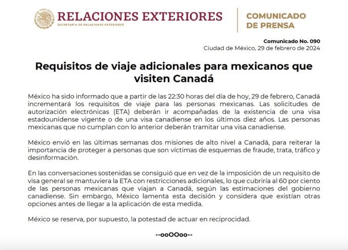 A partir de las 23:30 (hora del Este) del 29 de febrero de 2024, los ciudadanos mexicanos van a necesitar visa para entrar a Canadá, a menos que cumplan con ciertos criterios.