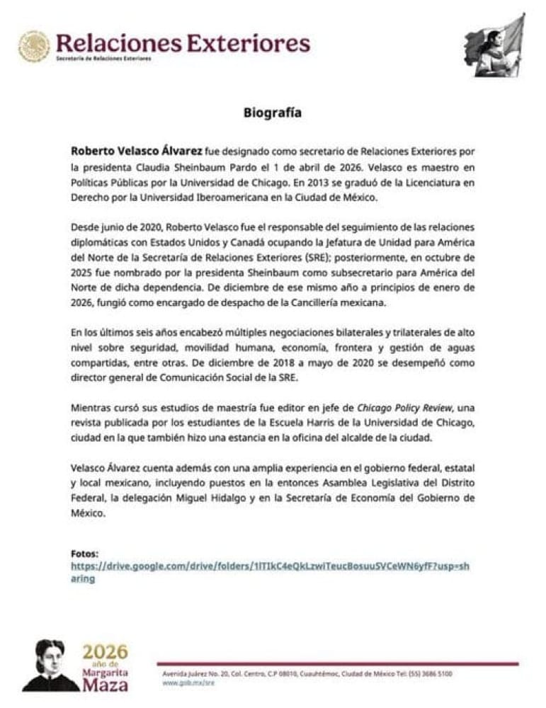 En el mismo mensaje, también confirmó que Roberto Velasco Álvarez, quien hasta hoy se desempeñaba como Subsecretario para América del Norte, asume la titularidad de la Secretaría de Relaciones Exteriores.
