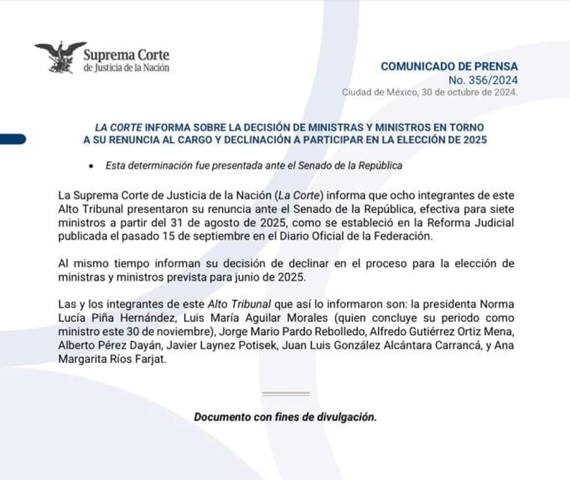 En tanto, el ministro Alberto Pérez Dayán fue uno de los que decidió evitar hacer pronunciamiento alguno en su carta de renuncia para no incurrir en ningún impedimento de cara a la discusión de la constitucionalidad de la reforma judicial.