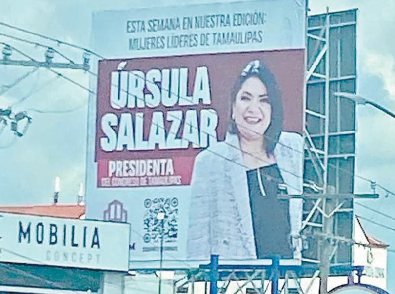 Sin embargo, Salazar, quien preside el Congreso de Tamaulipas, es promovida en las principales avenidas del sur del estado, por medio de anuncios "fachada", para evadir la ley electoral, que son firmados por una editorial que no se identifica.