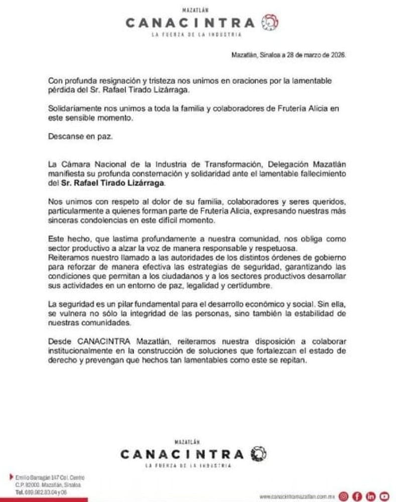 Al respecto, la Cámara Nacional de la Industria Nacional de la Transformación (Canacintra) en Mazatlán, lanzó un comunicado condenando el asesinato del empresario.