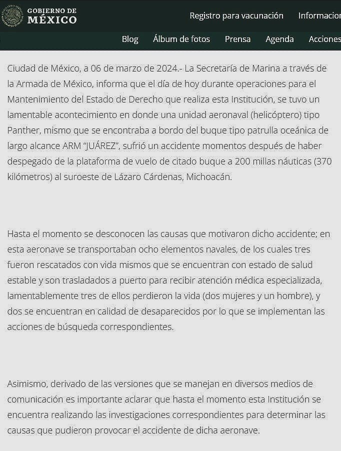 "El día de hoy durante operaciones para el Mantenimiento del Estado de Derecho que realiza esta Institución, se tuvo un lamentable acontecimiento en donde una unidad aeronaval (helicóptero) tipo Panther, mismo que se encontraba a bordo del buque tipo patrulla oceánica de largo alcance ARM JUÁREZ, sufrió un accidente momentos después de haber despegado de la plataforma de vuelo del citado buque", detalló la Marina.
