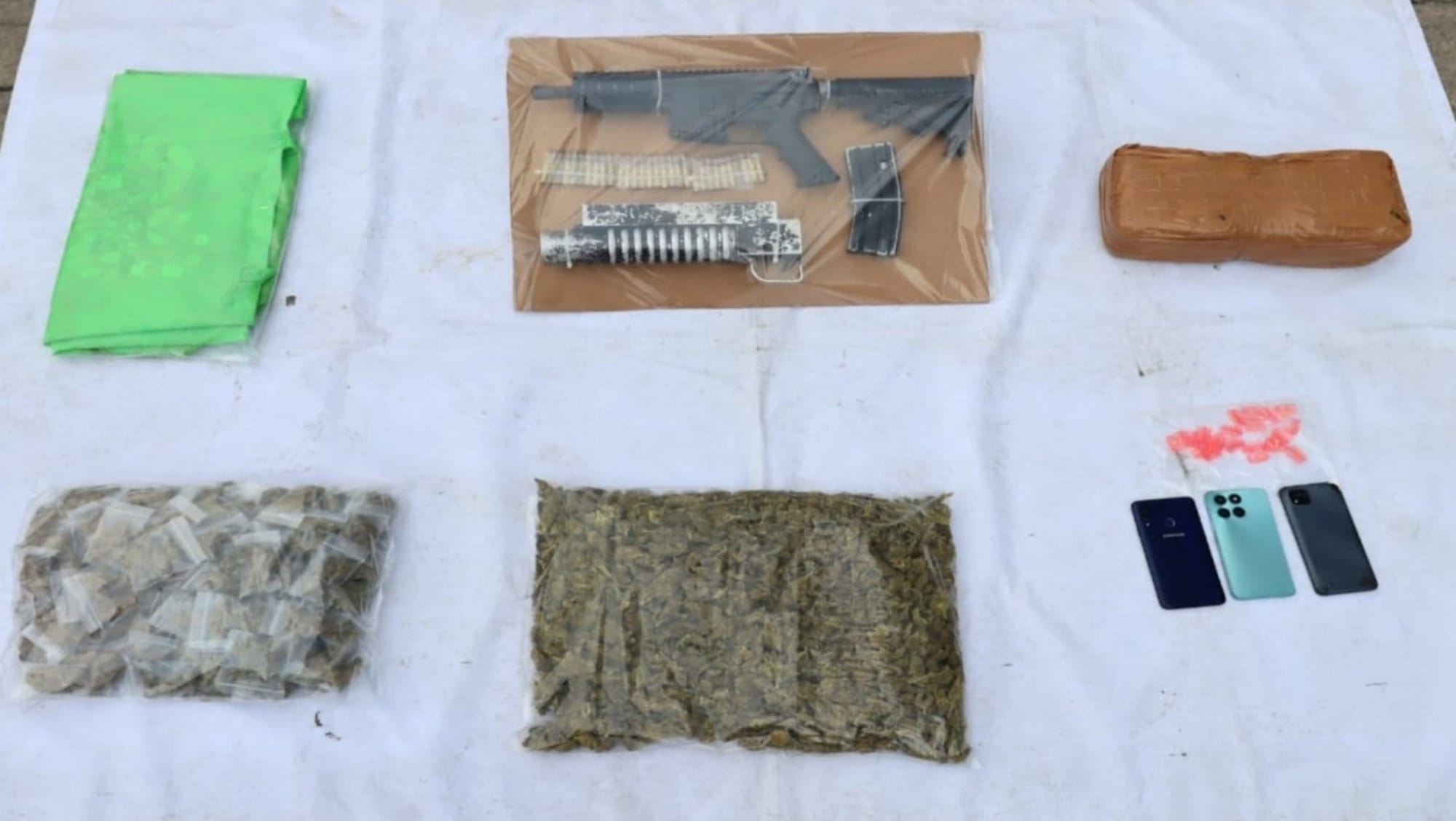 Al inspeccionar, los elementos reportaron el hallazgo de un arma larga, un tubo lanzagranadas, 30 cartuchos útiles y un cargador, 3.9 kilos de marihuana, dosis de metanfetamina y un vehículo con reporte de robo.