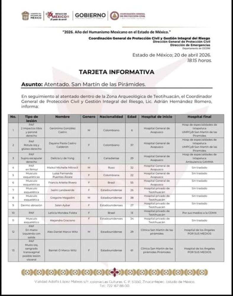 Cristóbal Castañeda, secretario de Seguridad del Estado de México, donde se ubica el recinto, detalló que cuatro personas resultaron lesionadas por arma de fuego.