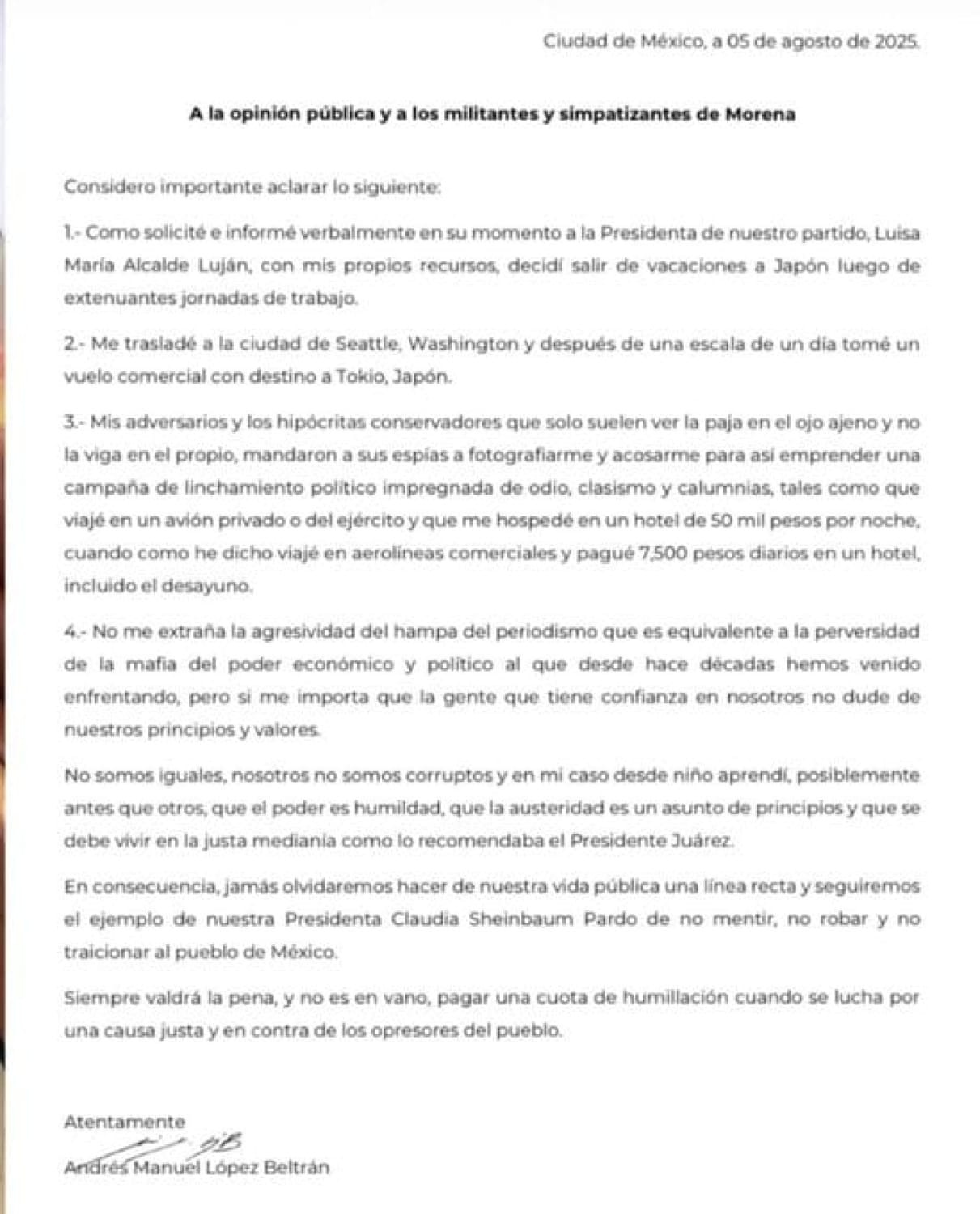 CIUDAD DE MEXICO. (Agencias).- Gerardo Fernández Noroña, presidente de la Mesa Directiva del Senado, consideró que la carta publicada por Andrés Manuel López Beltrán, secretario de organización de Morena e hijo del expresidente Andrés Manuel López Obrador, para justificar sus vacaciones en Japón, es “malísima”.