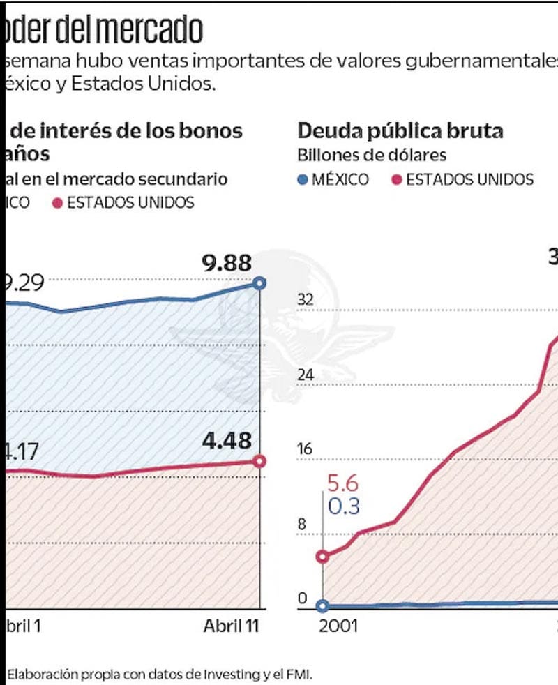 En tanto, los bonos que coloca al mismo plazo el gobierno del presidente Donald Trump, conocidos como treasuries, cerraron en 4.48%. Para ambos países se trata del mayor interés desde el pasado 20 de febrero, de acuerdo con los registros de Investing.