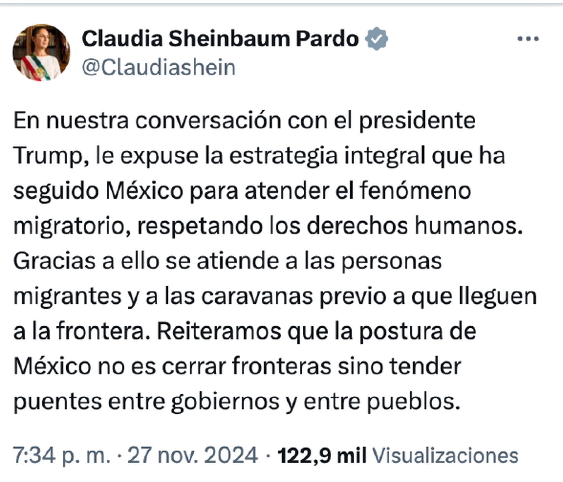 "Tuve una excelente conversación con el presidente Donald Trump. Abordamos la estrategia mexicana sobre el fenómeno de la migración y compartí que no están llegando caravanas a la frontera norte porque son atendidas en México", escribió en redes sociales.