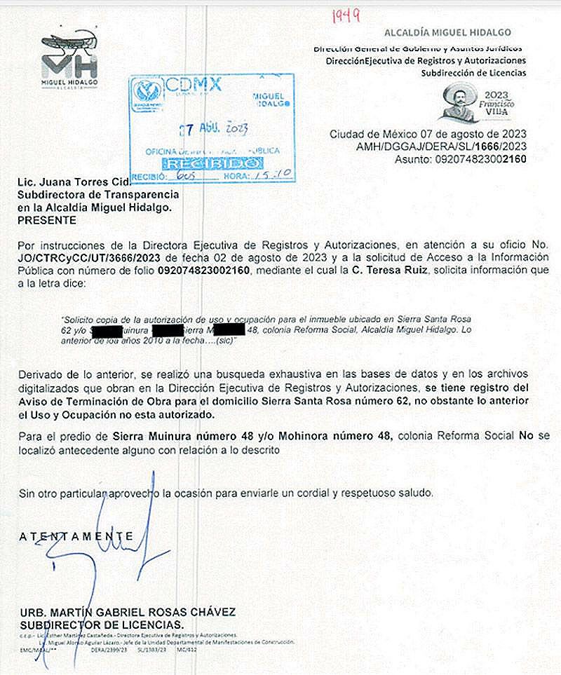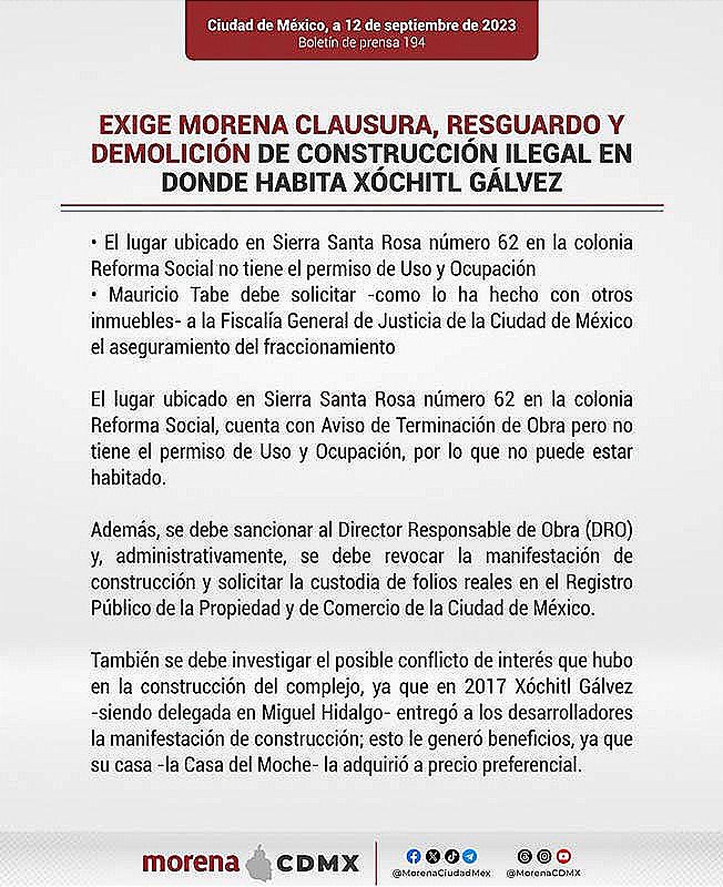 En una tarjeta informativa, la alcaldía precisó que el predio y la construcción señaladas tienen Registro de Manifestación de Construcción, además de que el desarrollo fue registrado ante el Registro Público de la Propiedad y del Comercio de la Ciudad de México (RPPyC).